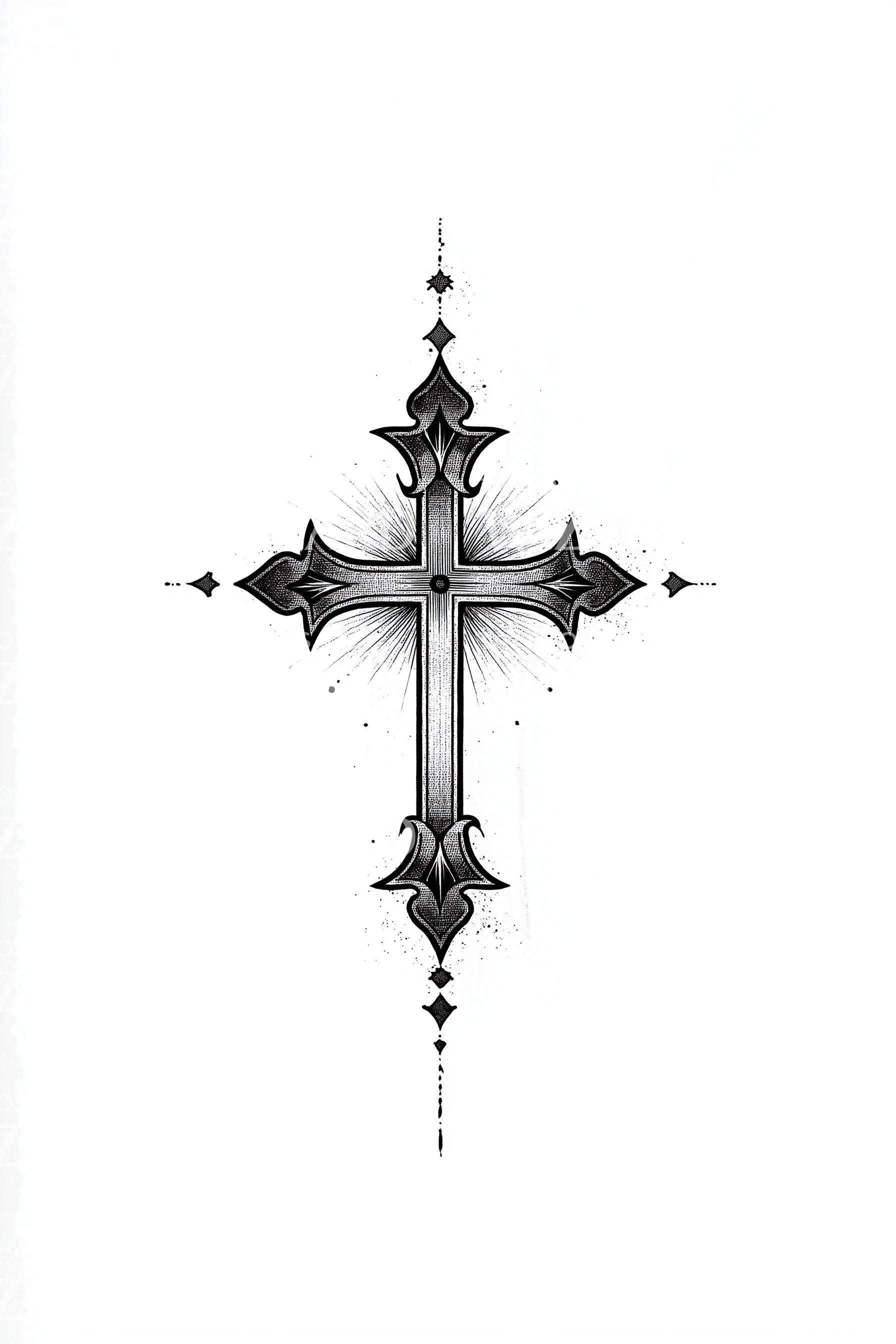 Ozdobte svou pokožku vírou a elegancí s naším tetovacím motivem barokového kříže. Tento ozdobný mistrovský kousek mistrně kombinuje černé a šedé tóny, aby vytvořil vznešené vyjádření víry. Jeho jemné barokní vzory dodávají nadčasový, přesto sofistikovaný vzhled, který přesahuje pouhou estetiku.
