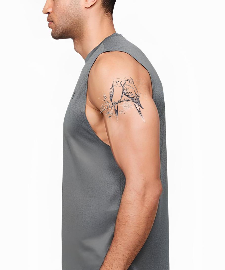 Přijměte svou lásku k domácím mazlíčkům s tímto černobílým tetovacím motivem. Působivý portrét andulek a papouškovců, zachycující podstatu těchto milovaných ptáků v jemných detailech. Na míru vytvořeno pro všechny milovníky ptáků, nenápadně vyjadřuje vaši náklonnost k krásným druhům papoušků. Vyvolejte na své kůži svobodného ducha těchto okřídlených zázraků.