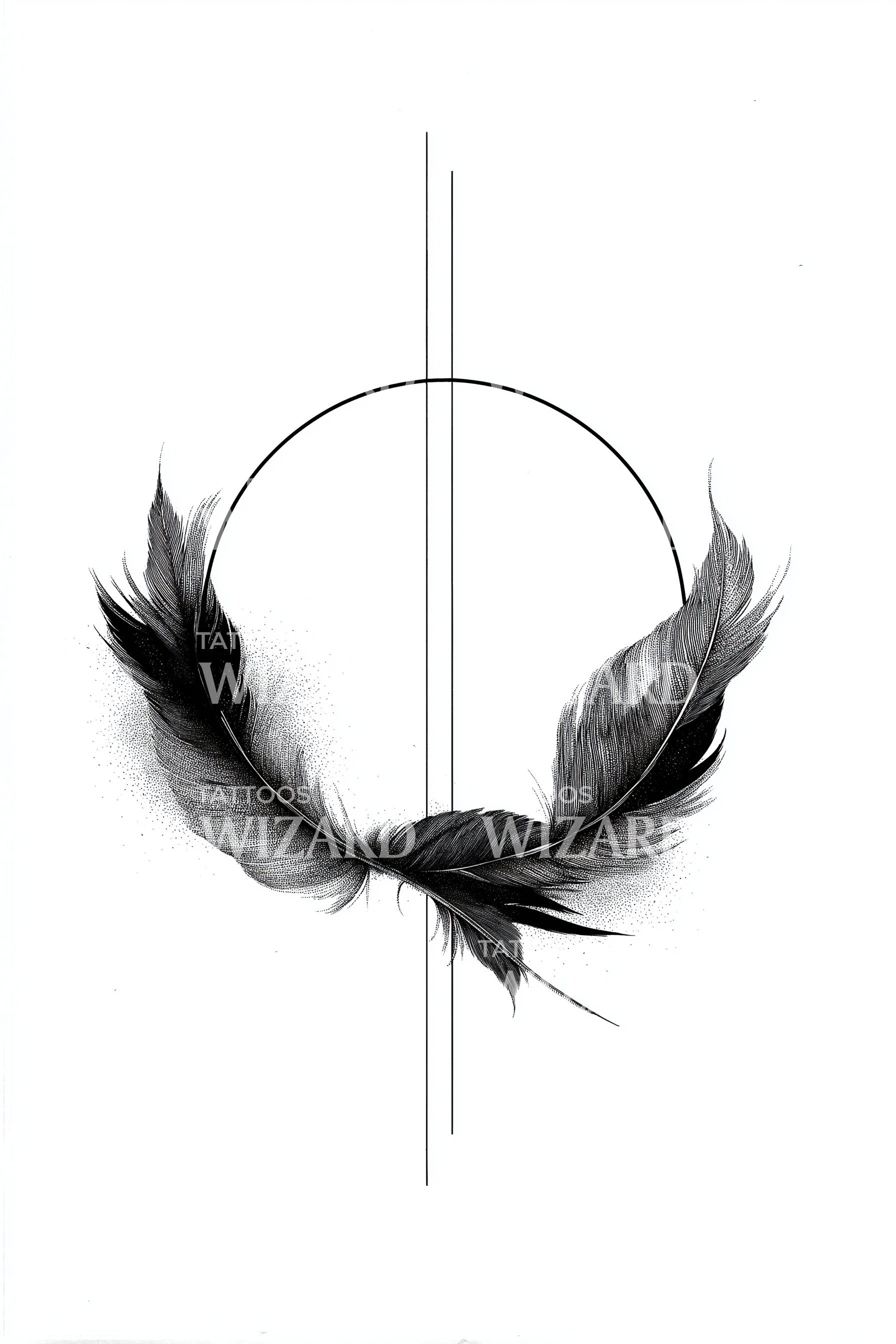 Blackwork halo wreath unfurls in soft dotwork feathers, cradling a clean circle split by two slender pillars. Feathers whisper freedom and protection; the wreath honors cycles and quiet triumph; the halo sanctifies intention. Minimal and boho, this elegant mark feels weightless yet grounded, inviting calm courage every day.
