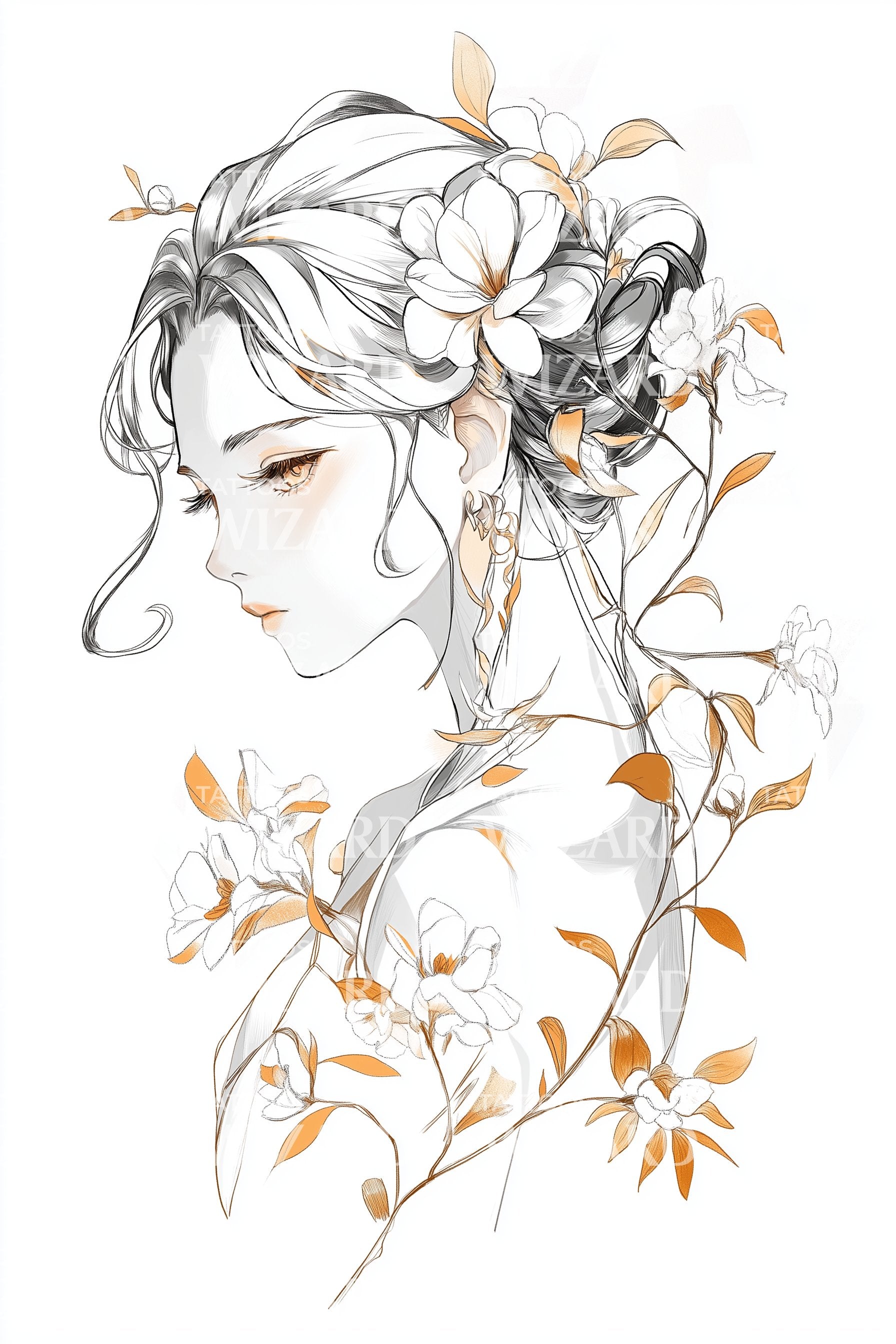 Tento elegantní design tetování v jemné lince nabízí jedinečnou ženskou estetiku. Kombinací jemné kresby a květinových akcentů vytváří poutavý portrét plný jemnosti a sofistikovanosti. Ideální pro každého, kdo touží po složitém, přesto nenápadně přitažlivém výrazném kousku.