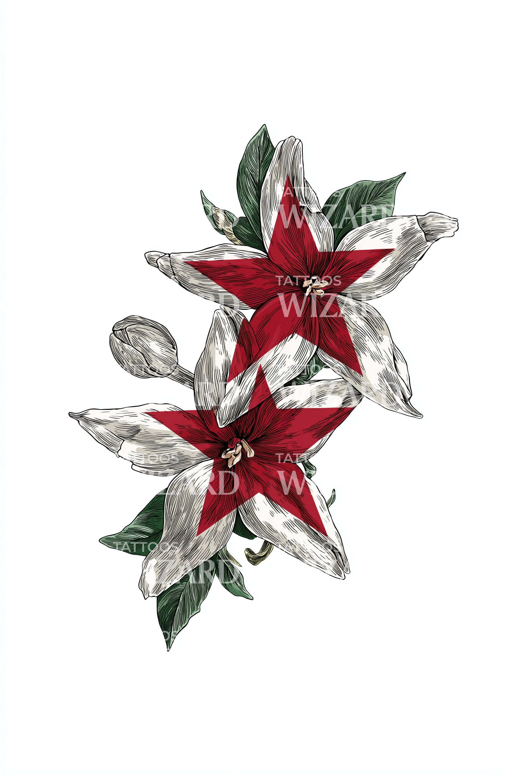 Ponořte se do šťavnaté bohatosti italské flóry s tímto návrhem tetování kytice. Detailně zpracované s bujnými zelenými a vášnivými červenými odstíny, zdůrazňuje hvězdný motiv, který spojuje zemskou přitažlivost květin s nebeskou vznešeností. Tento kousek přináší živý a zajímavý dotek vaší přirozené estetice.