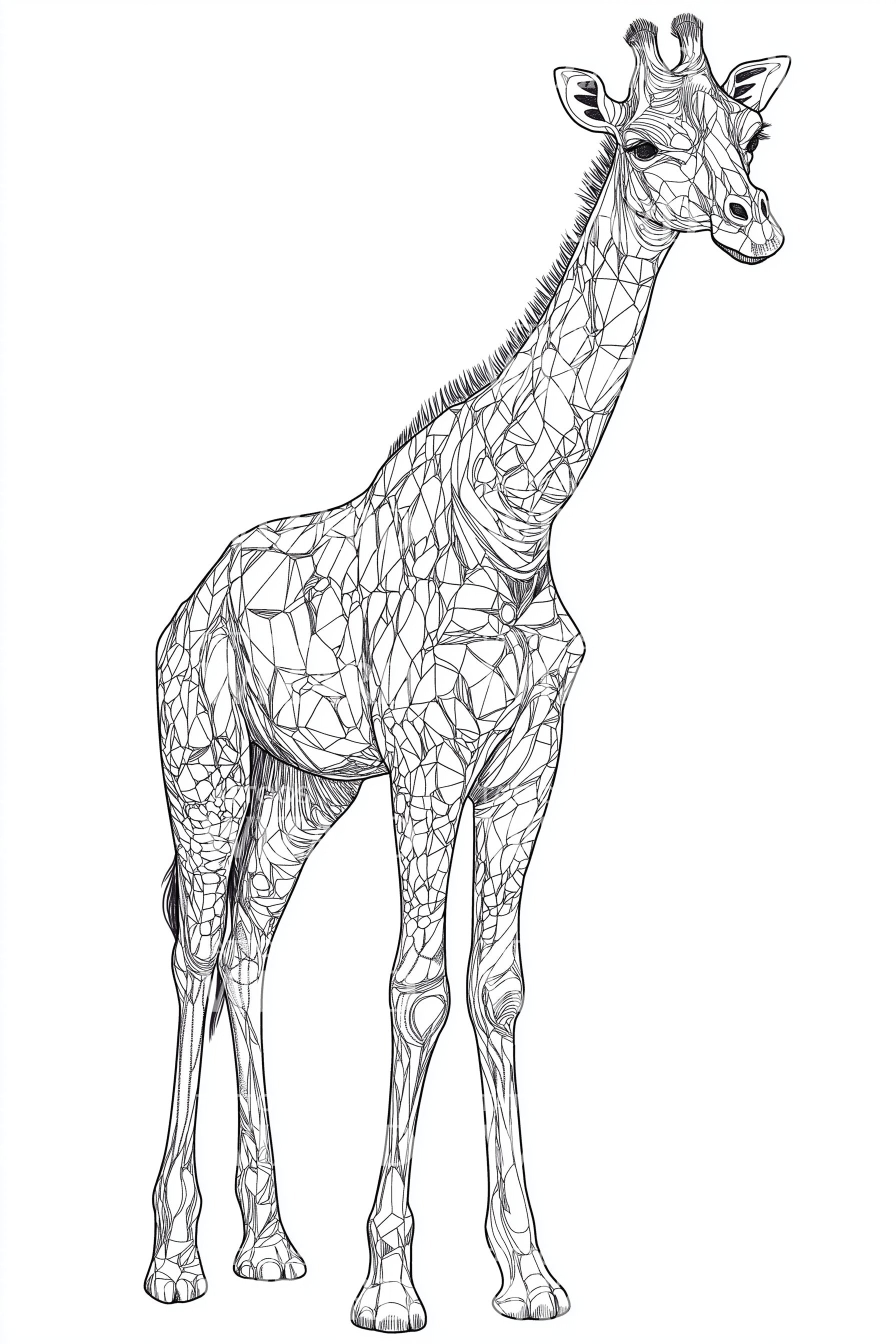 Geometric giraffe rendered in intricate polygonal linework, a modern sculpture drawn in ink. Faceted shapes echo savanna sunlight, mapping perspective, patience, and quiet elevation. Symbol of grace that sees farther, it celebrates wild wonder and gentle strength. Wearing it feels focused, upright, adventurous, and unmistakably your own, always.