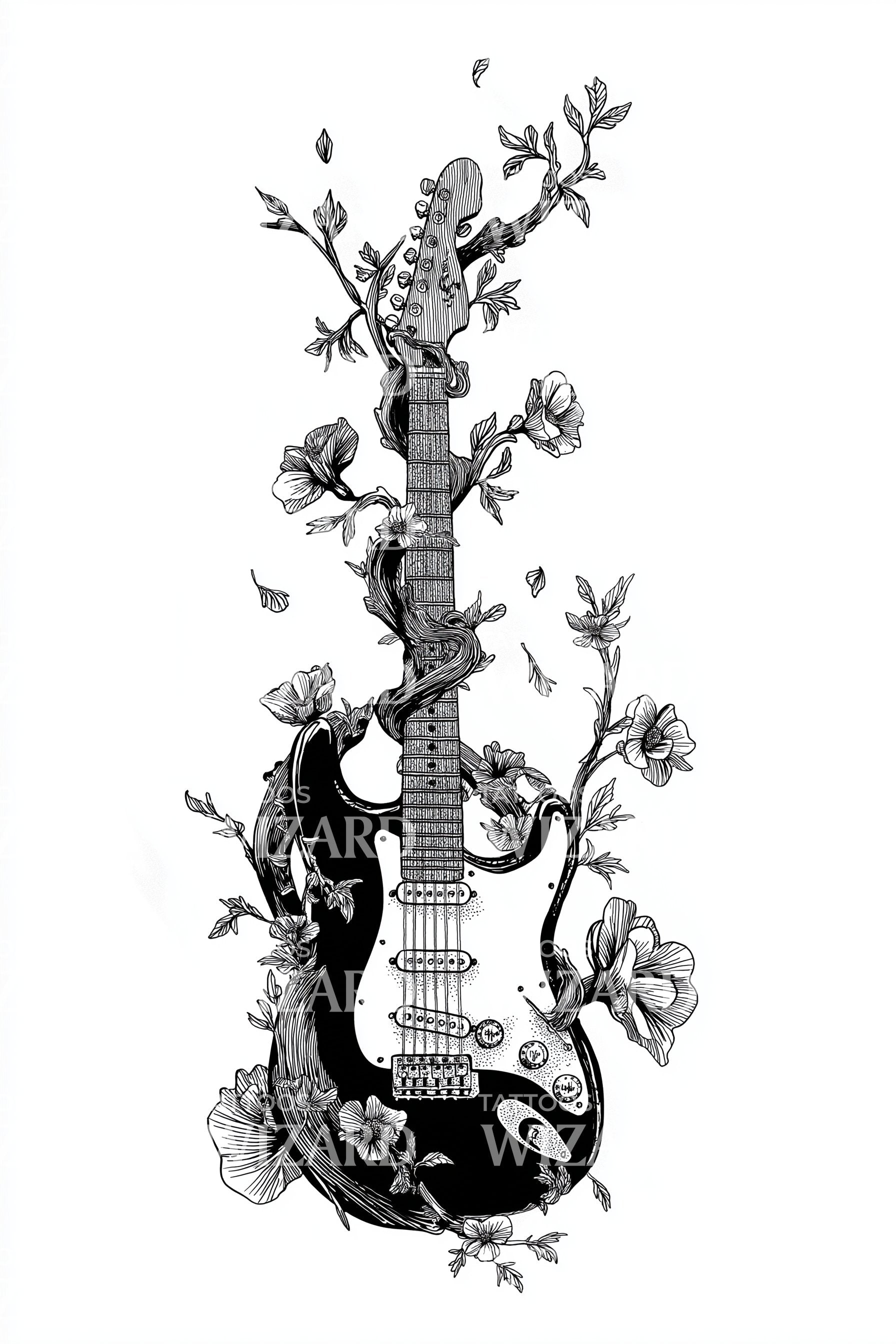 Ponořte se do symfonie umění s tímto ilustrativním tetovacím motivem. Krásně spojuje vaši lásku k hudbě a přírodě, představující výraznou kytaru propletenou květinovými révami. Kontrast mezi strunným nástrojem a jemnými révami vytváří okouzlující vizuální melodii. Ideální pro hudebně založené milovníky flóry.