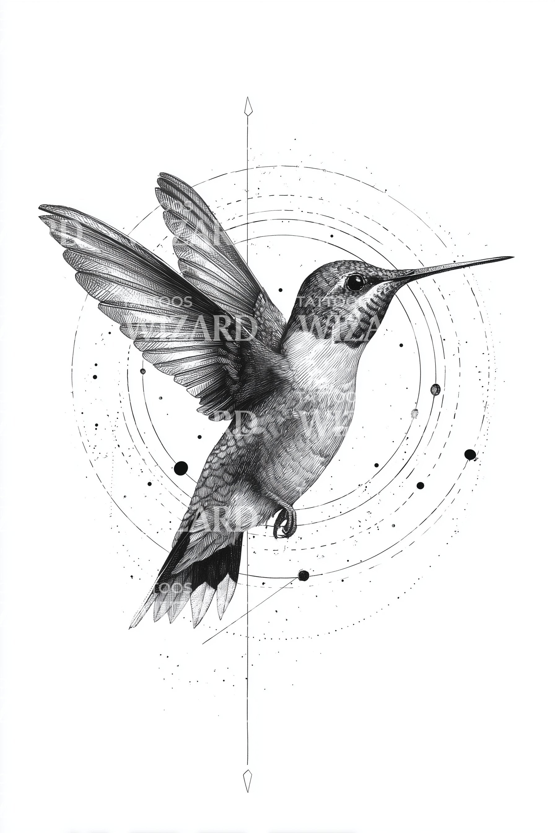 Fine-line geometry frames a poised hummingbird, wings etched with crisp detail, circling within orbital rings and precise points. This union of flight and calculation honors momentum held in balance. A reminder to move lightly yet intentionally, it lends the wearer clarity, resilience, and calibrated joy and quiet focus.
