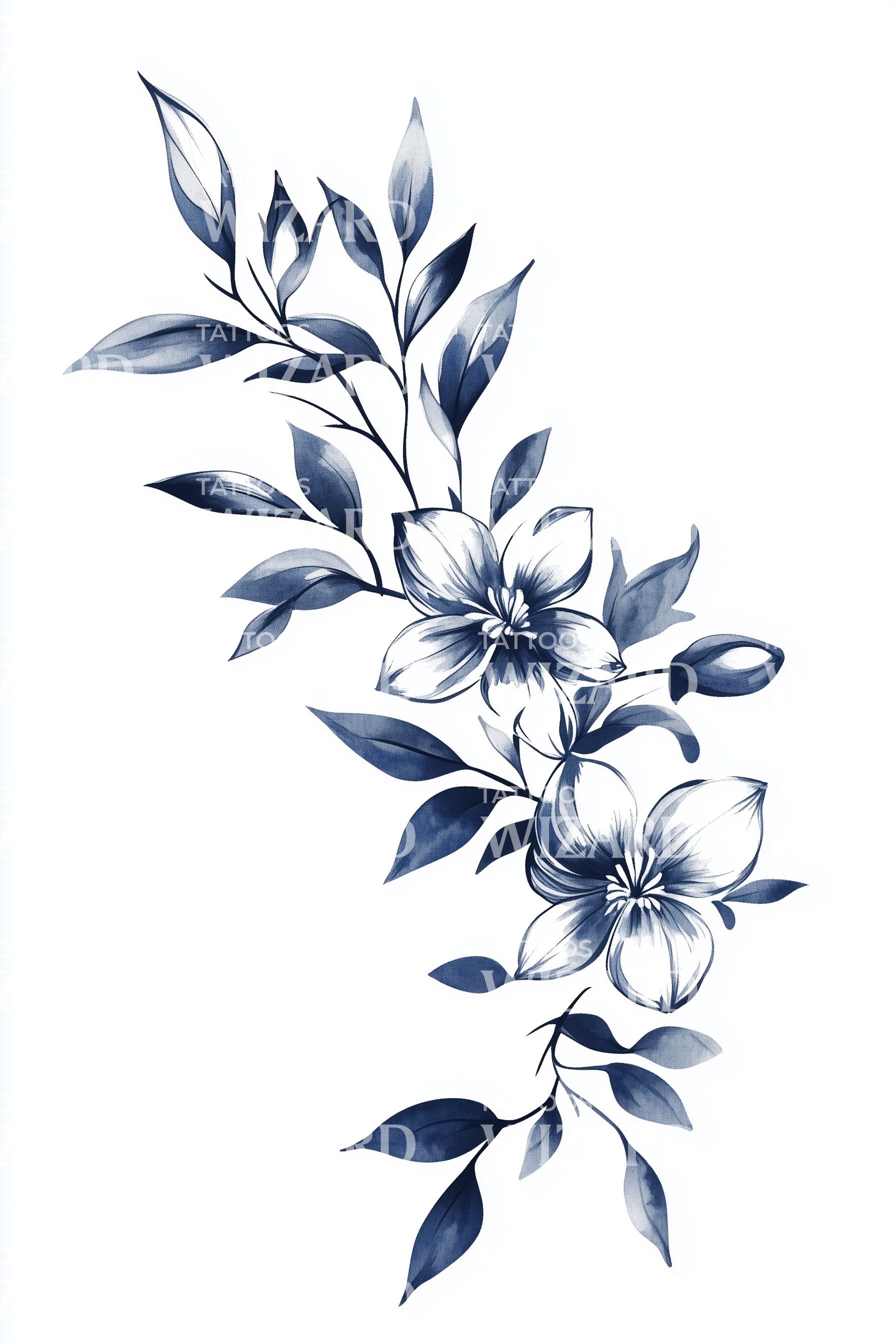 Ponořte se do dramatického kouzla tohoto blackwork tetování. Intenzivní tmavý inkoust vytváří výraznou siluetu rozkvétajícího květu na větvi, přinášející nepopiratelný umělecký rozkvět. Ideální volba pro milovníky květinové estetiky a tajemné krásy noir.