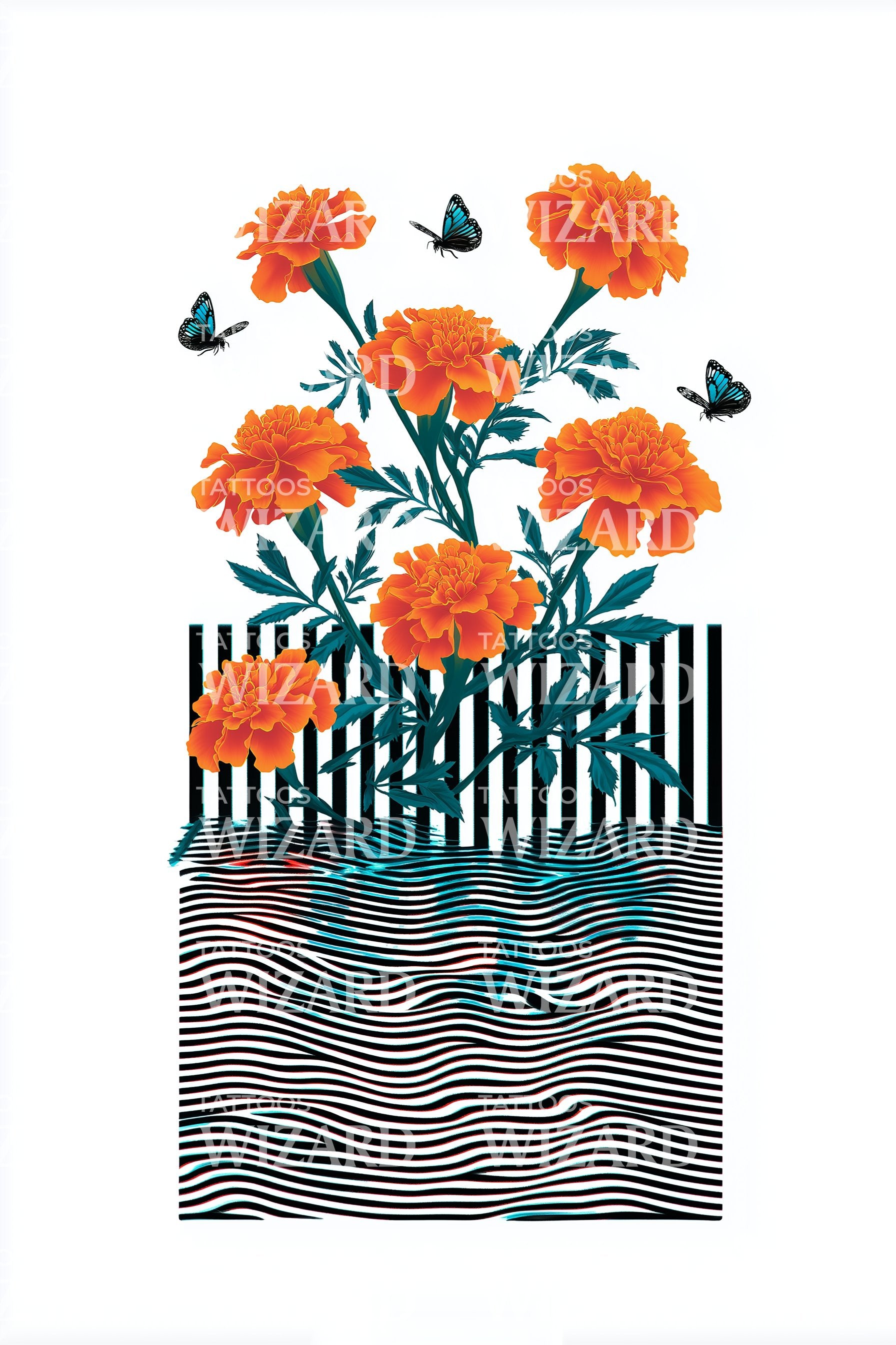 Ponořte se do nostalgie s tímto vynikajícím vintage tetovacím motivem. Tento design, zobrazující živý ilustraci kytice měsíčků, zachycuje okouzlující půvab tradiční zahrady s krásně propracovaným plotem. Ztělesňuje nadčasovou květinovou estetiku a je ideální pro ty, kteří oceňují krásu přírody.