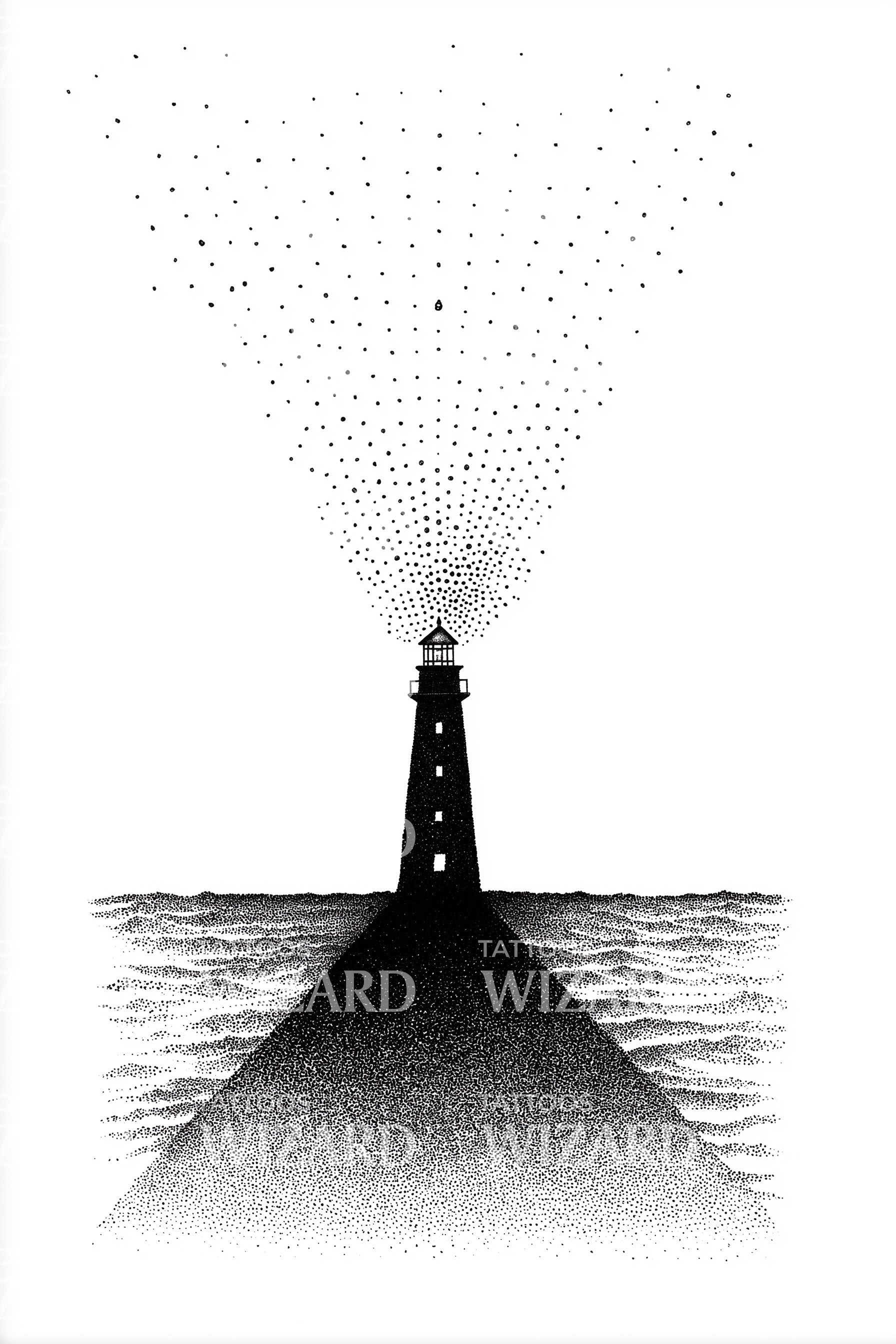 A geometric dotwork lighthouse rises from textured water, its triangular beam blooming into a constellation while a mirrored shadow points home. Clean lines and precise stippling turn night into a compass. Symbol of guidance and resilience, this design feels steady, luminous, and quietly fearless, for storm-bright journeys.