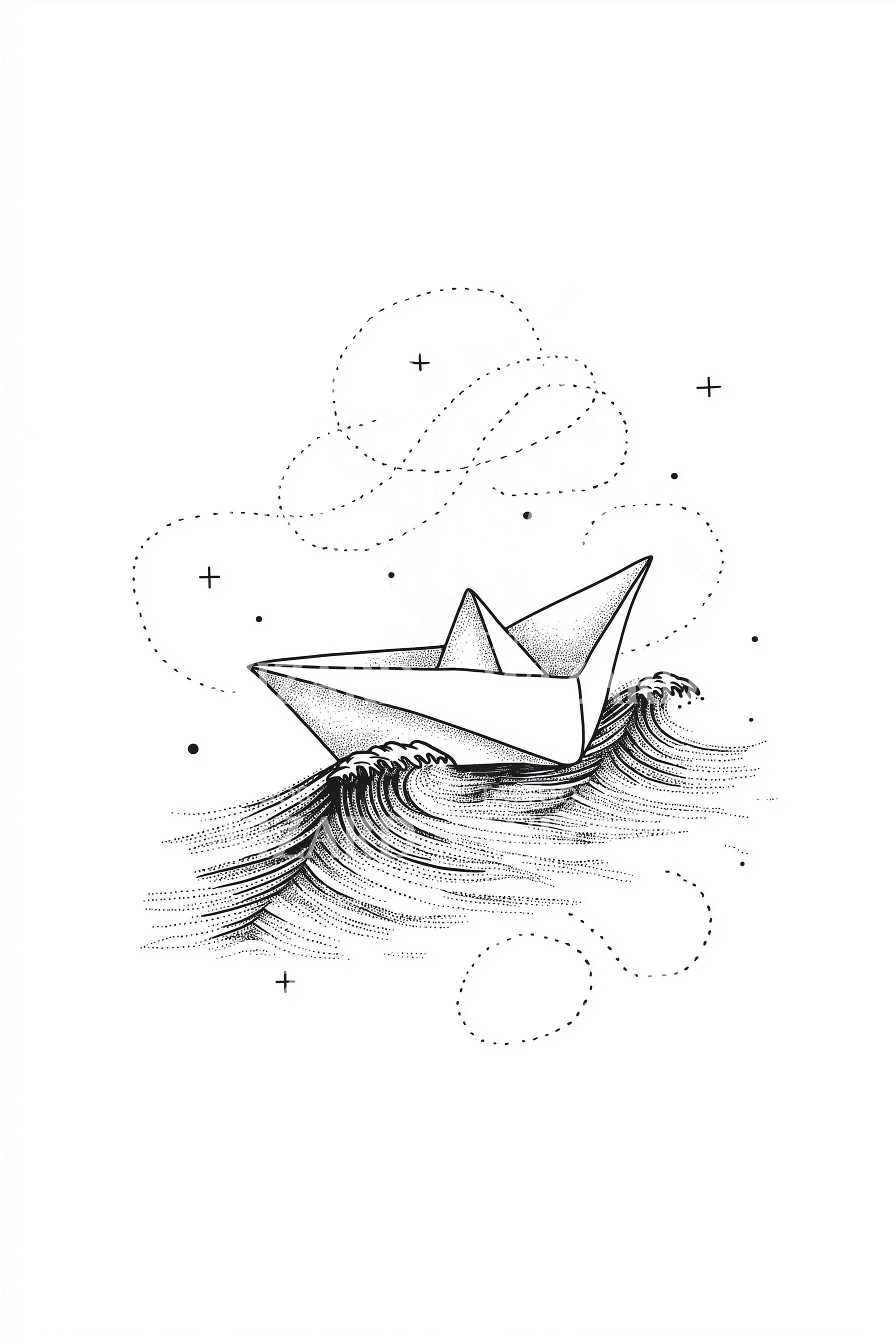 Fine dotwork sketches a crisp paper boat riding textured waves, trailed by playful wind loops and tiny stars. Symbolizing beginnings and brave small steps, this voyage honors curiosity and resilience. Worn on skin, it feels lighthearted yet steadfast, a reminder to sail forward with wonder, hope and play.