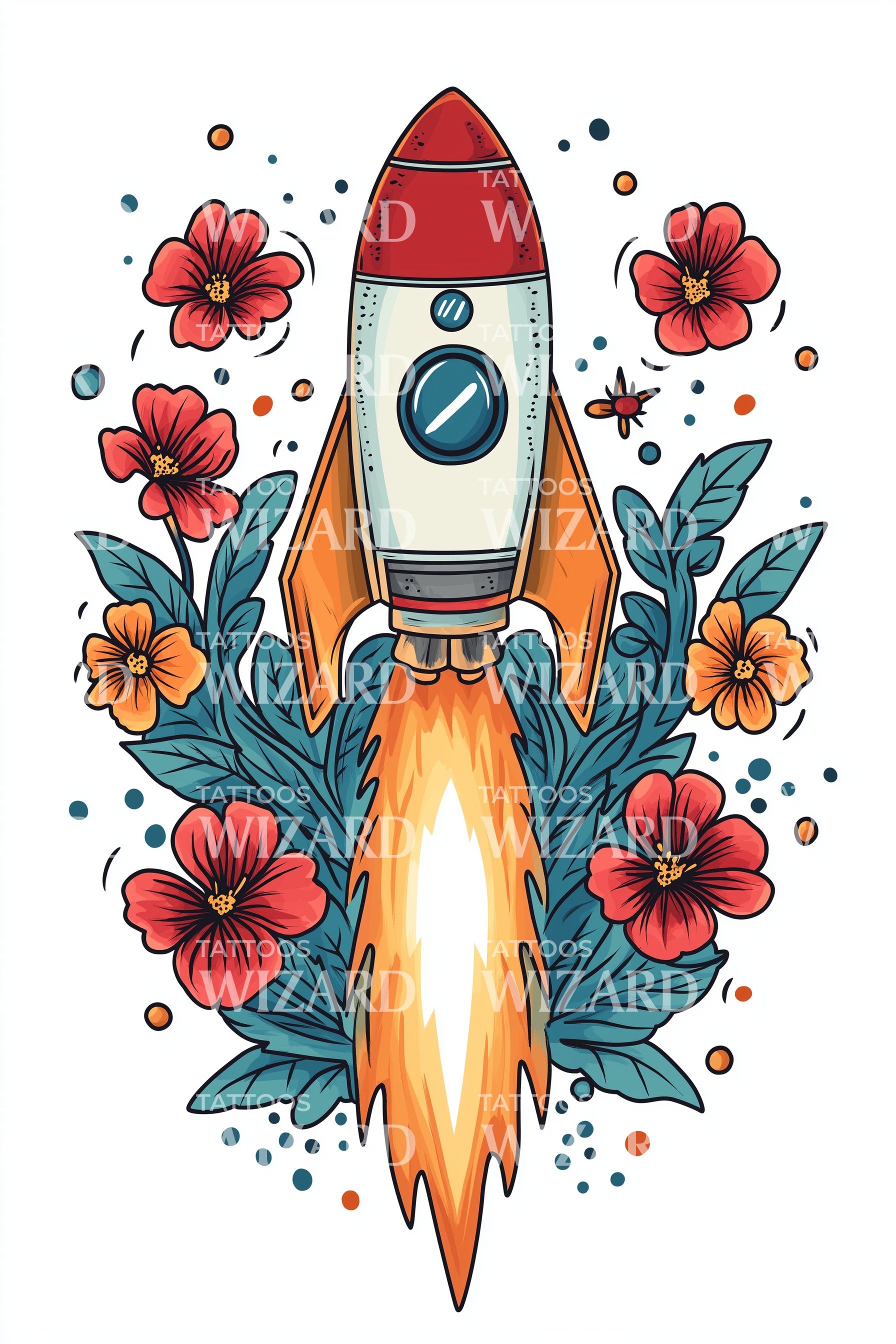 Rozpoutejte svou jedinečnost tímto živým, novodobým tetovacím motivem. Přijměte nostalgii s retro raketou na pozadí rozkvetlých květin. Tento barevný kousek spojuje vzrušení z vesmírného startu s půvabem výrazných květin, vytvářející jedinečně vyvážený výraz dobrodružství a krásy.