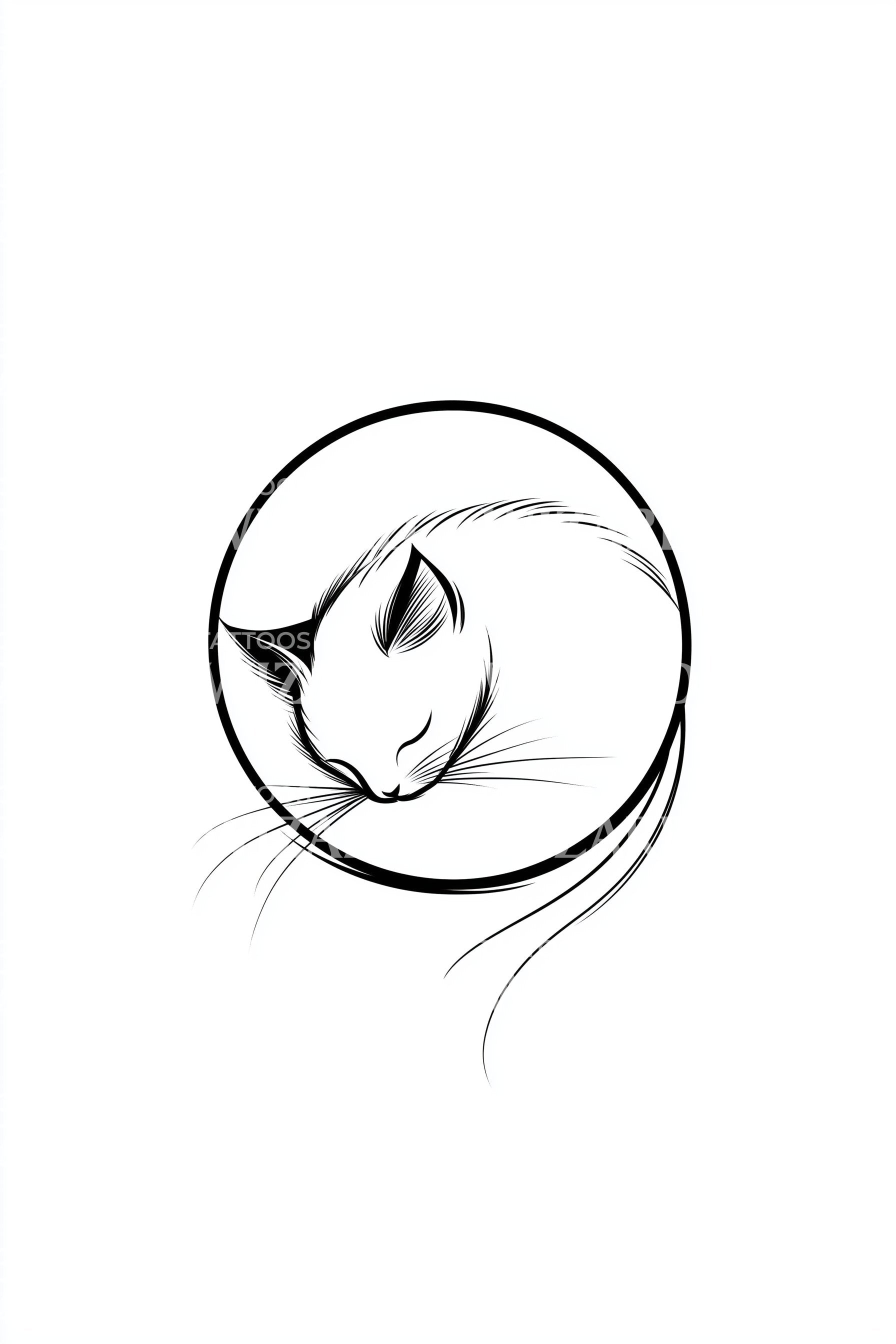 Tento tetovací motiv ve stylu skici zobrazuje tichou, tajemnou kočku, spokojeně stočenou. Mistrovství stínování vytváří výrazné stíny, které zvýrazňují texturu srsti a dodávají hloubku. Perfektní volba pro milovníky zvířat, kteří oceňují výtvarné umění a klidnou auru svých kočičích přátel.