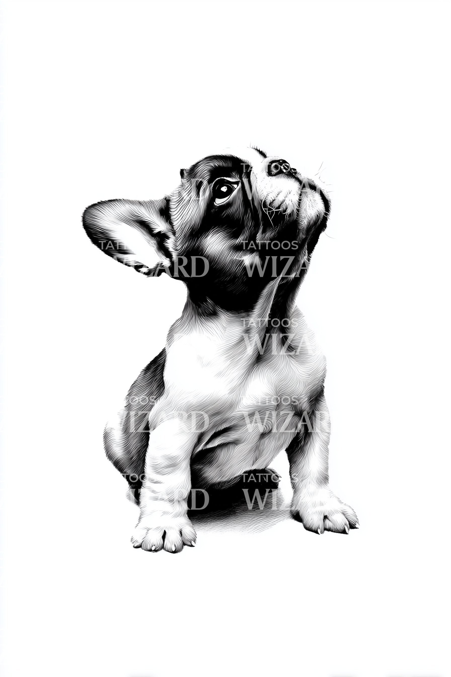 Ponořte se do krásy realismu s tímto monochromatickým tetováním buldoka. Tento design zobrazující roztomilého sedícího buldoka zachycuje podstatu vašeho oblíbeného psa. Je to výjimečný kousek, který harmonicky spojuje realismus a umění, ideální pro milovníky psů i nadšence tetování.