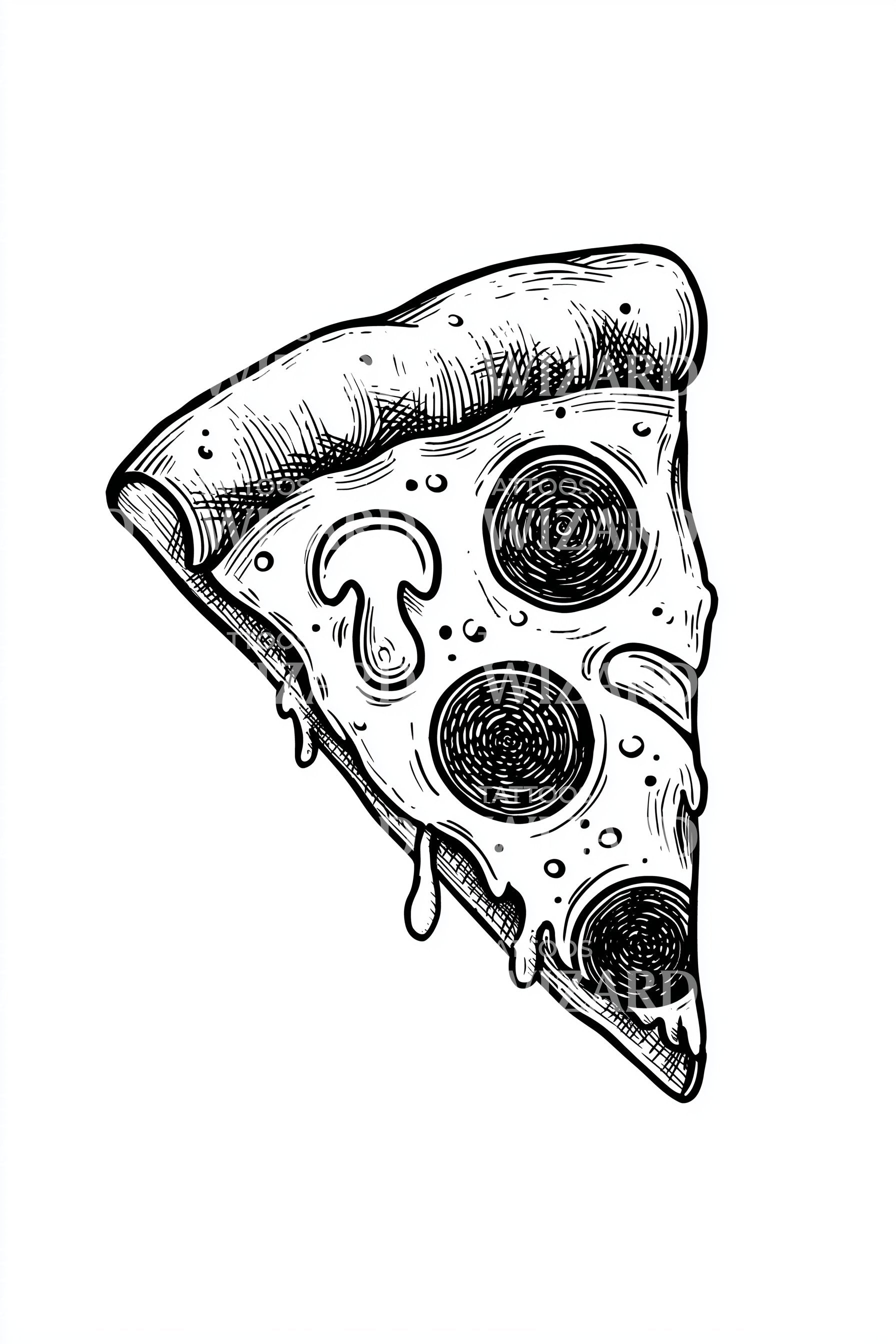 Jasné skicové linky zachycují lepkavý, kapající plátek pizzy, s vířícími pepperoni a houbami pod kůrkou. Symbol jednoduchých radostí a sdílených soust, ctí požitkářství, přátelství a sýrový optimismus. Nosit ho je zábavné a útulné. Ideální umístění: předloktí pro zúžení, lýtko pro plynulost, horní část paže jako odznak, kotník pro náznak.
