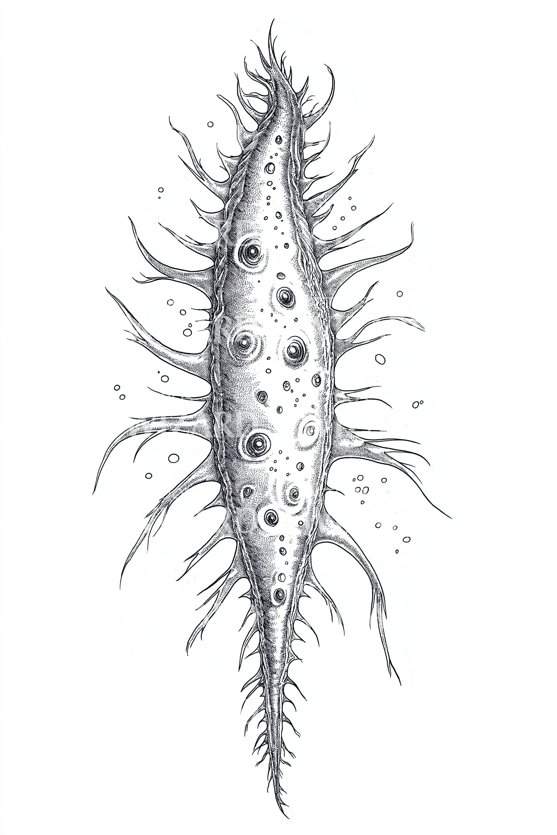 Microrealist diatom blooms along the skin, an elongated body ringed with fine spikes and crater-like pores, dotted with drifting bubbles. Symbol of cellular intelligence and quiet resilience, it honors life’s smallest architects. Wearing it feels curious, grounded, and fiercely alive, celebrating biology’s hidden constellations. A micro organism talisman.