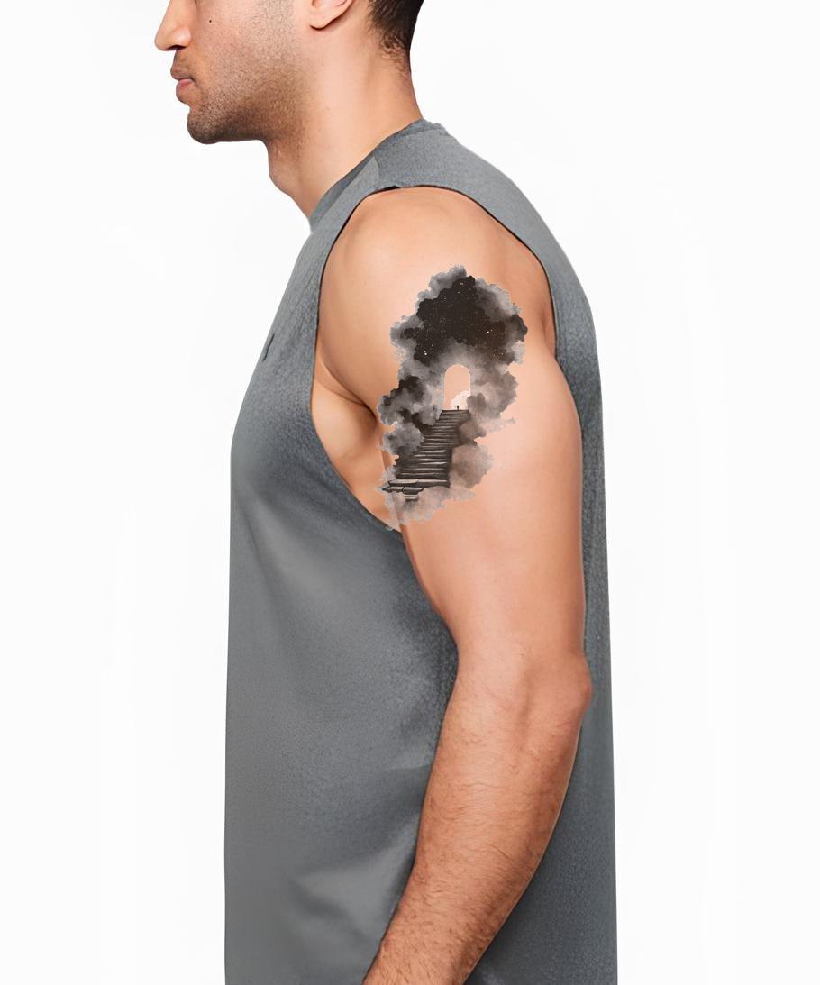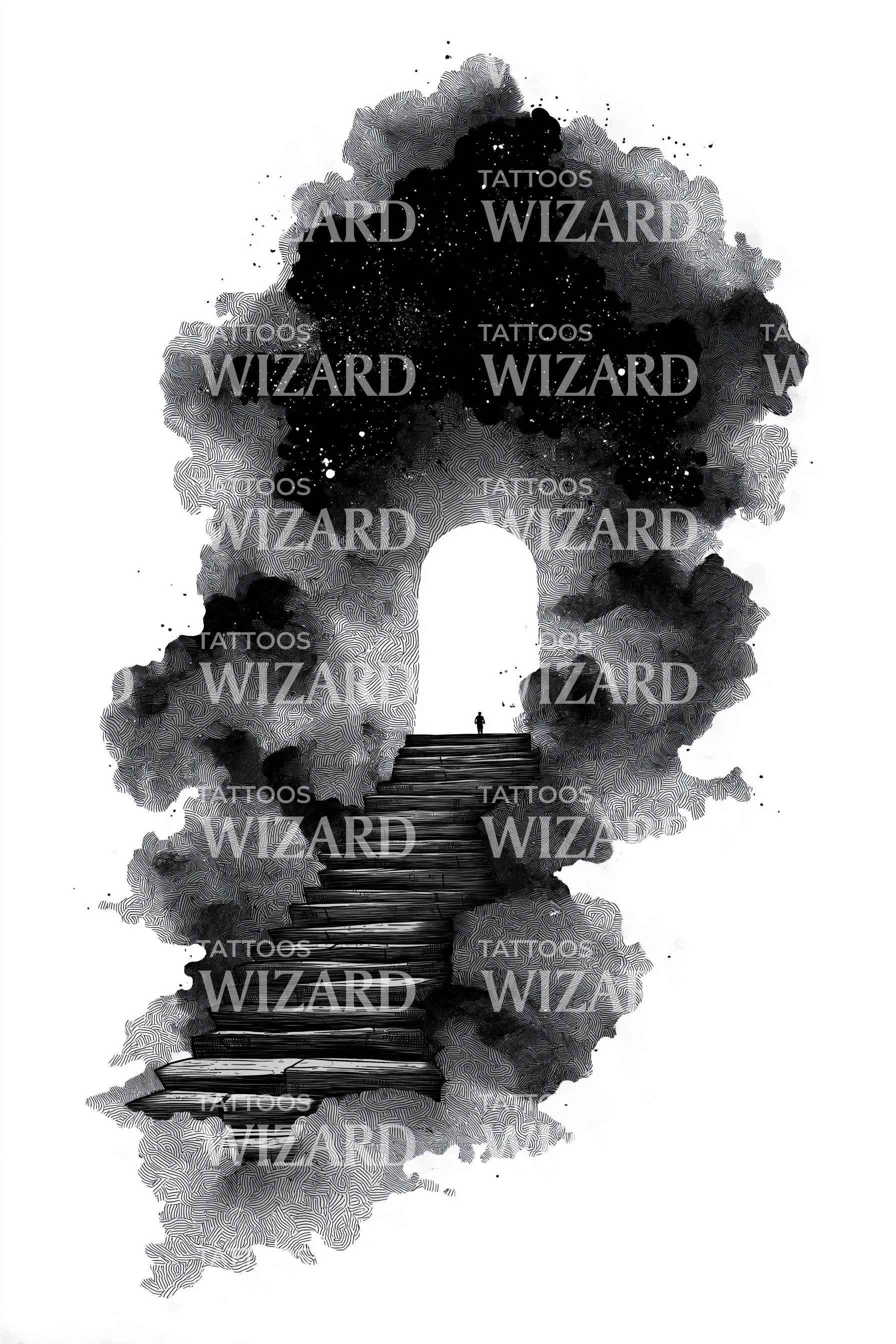 Vstupte do výjimečna s tímto akvarelovým tetovacím motivem, který zobrazuje tajemný stínový portál zasazený do schodů, symbolizující poutavý příběh. Šplouchnutí mlhavých textur umocňuje záhadný koncept a vytváří přitažlivou fúzi tajemství, umění a představivosti. Objevte záhadu zdobící vaši pokožku tímto dílem.