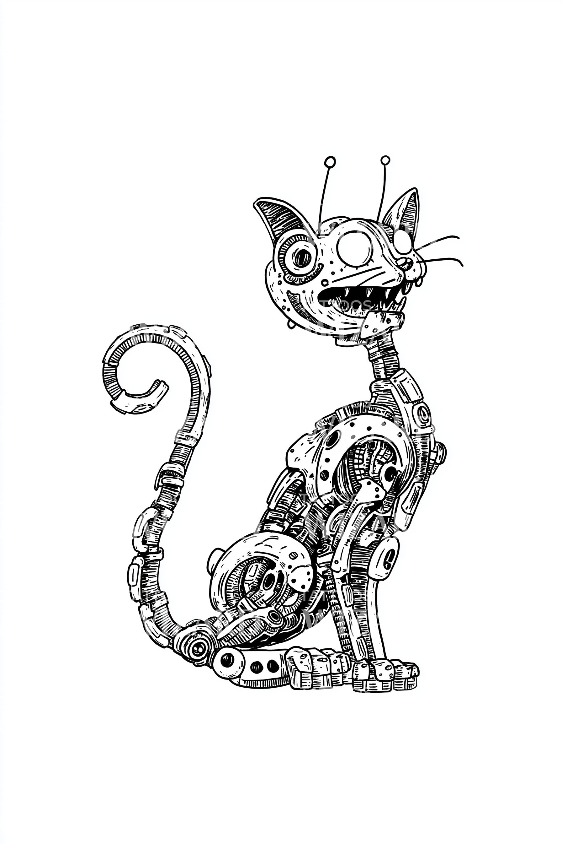 Clockwork feline of gears, antennaed ears and a segmented tail, a quirky steampunk cat radiating mechanical curiosity. Symbolizes wit forged from resilience and play, heart powered by imagination. Wearing it feels mischievous, inventive, individual. Ideal placements: forearm or calf for flow, upper arm or shoulder blade for silhouette.