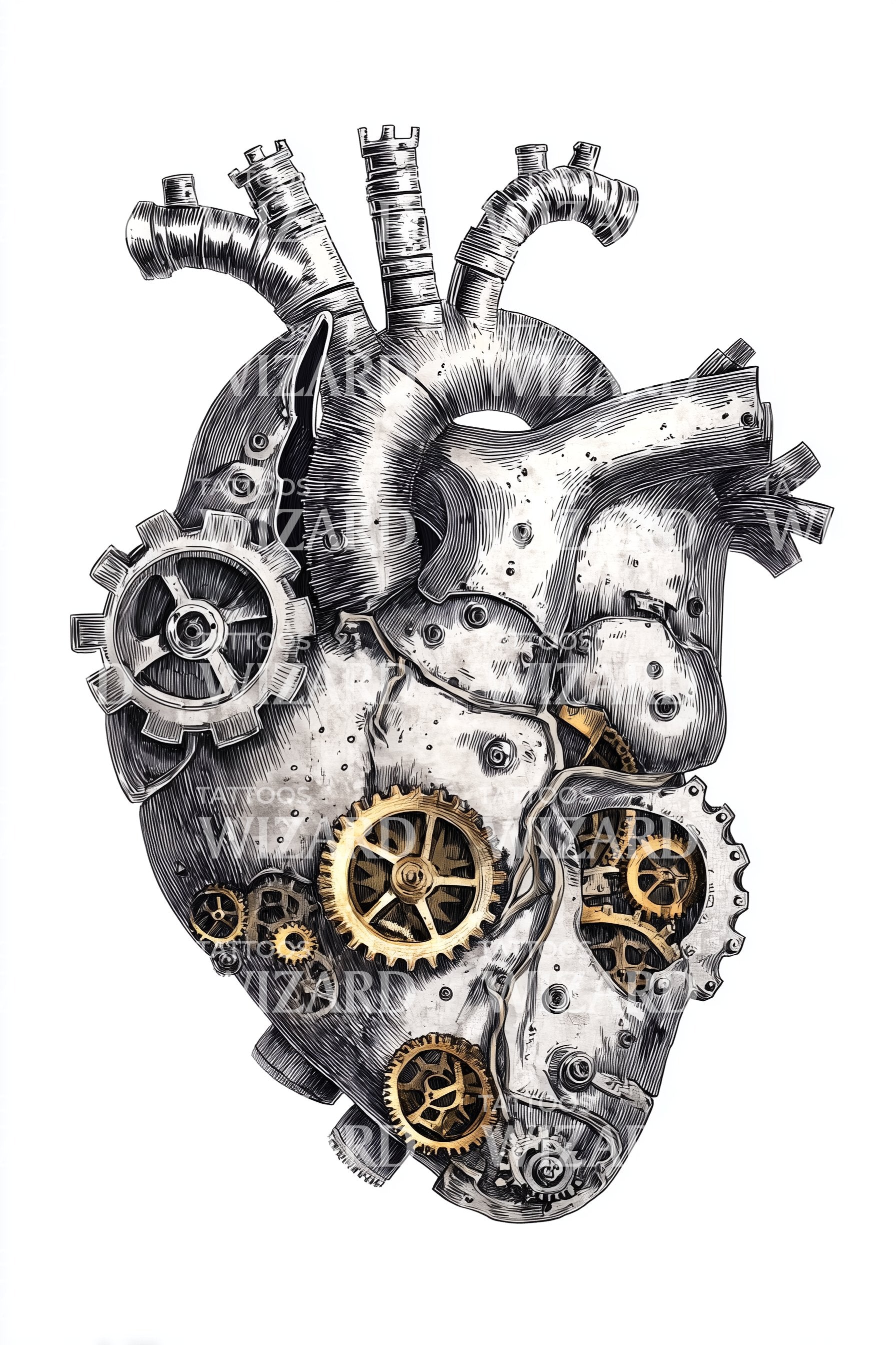Forged anatomical heart in black&grey, plates riveted and arteries piped, revealing interlocked gears and pistons. Symbolizes love as engine, resilience through grind, and time kept by courage. Wears like steady power. Ideal on sternum (heartbeat), inner forearm (vertical flow), ribs or calf (natural contours).