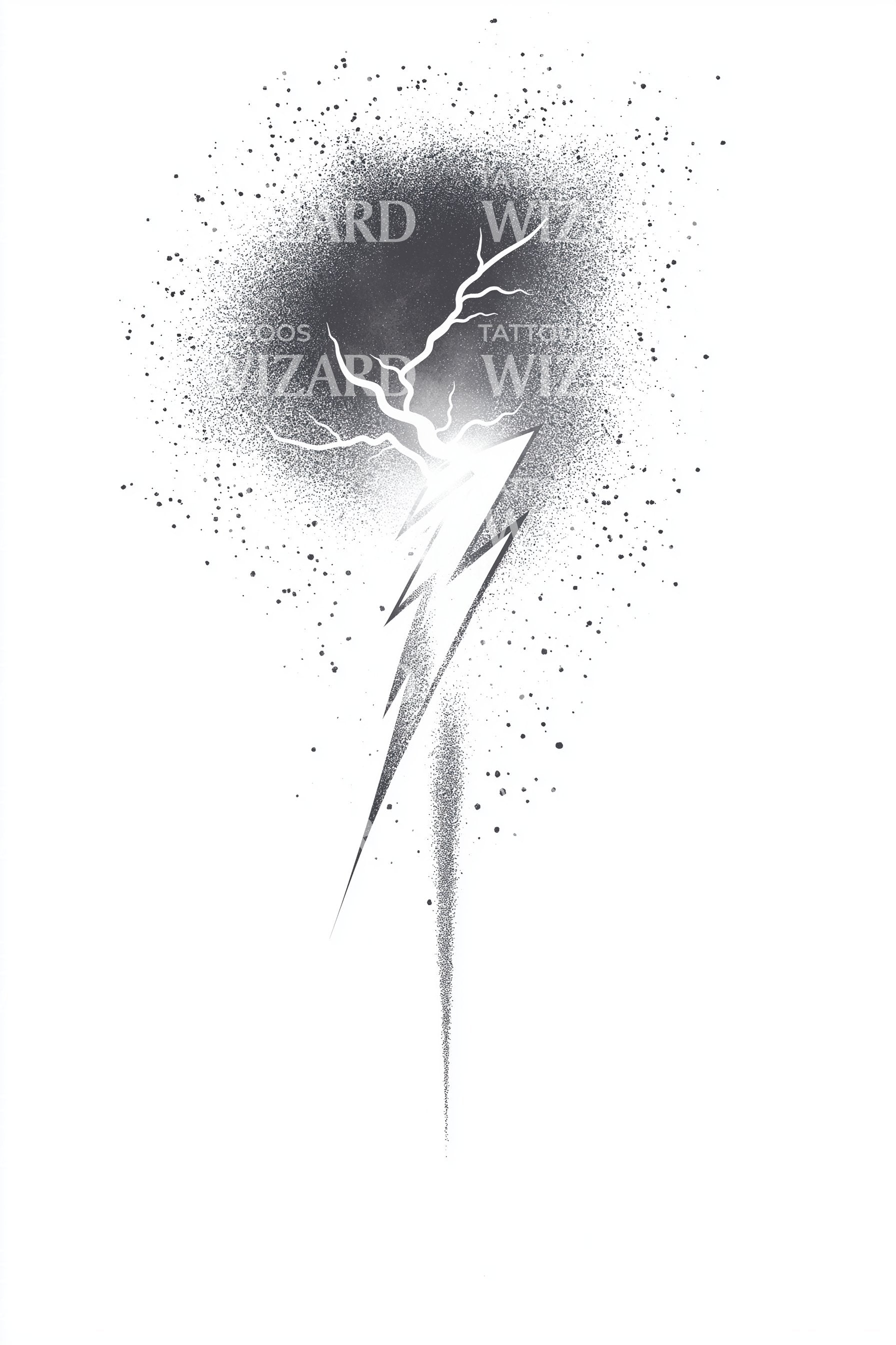 Blackwork stormburst frames a razor lightning strike, surrounded by soft dot spray and a brooding halo. The bolt symbolizes clarity cutting through chaos, raw power summoned in a single moment. Wearing it feels electric and centered, a reminder to choose decisive action, harness storms, and become your own surge.