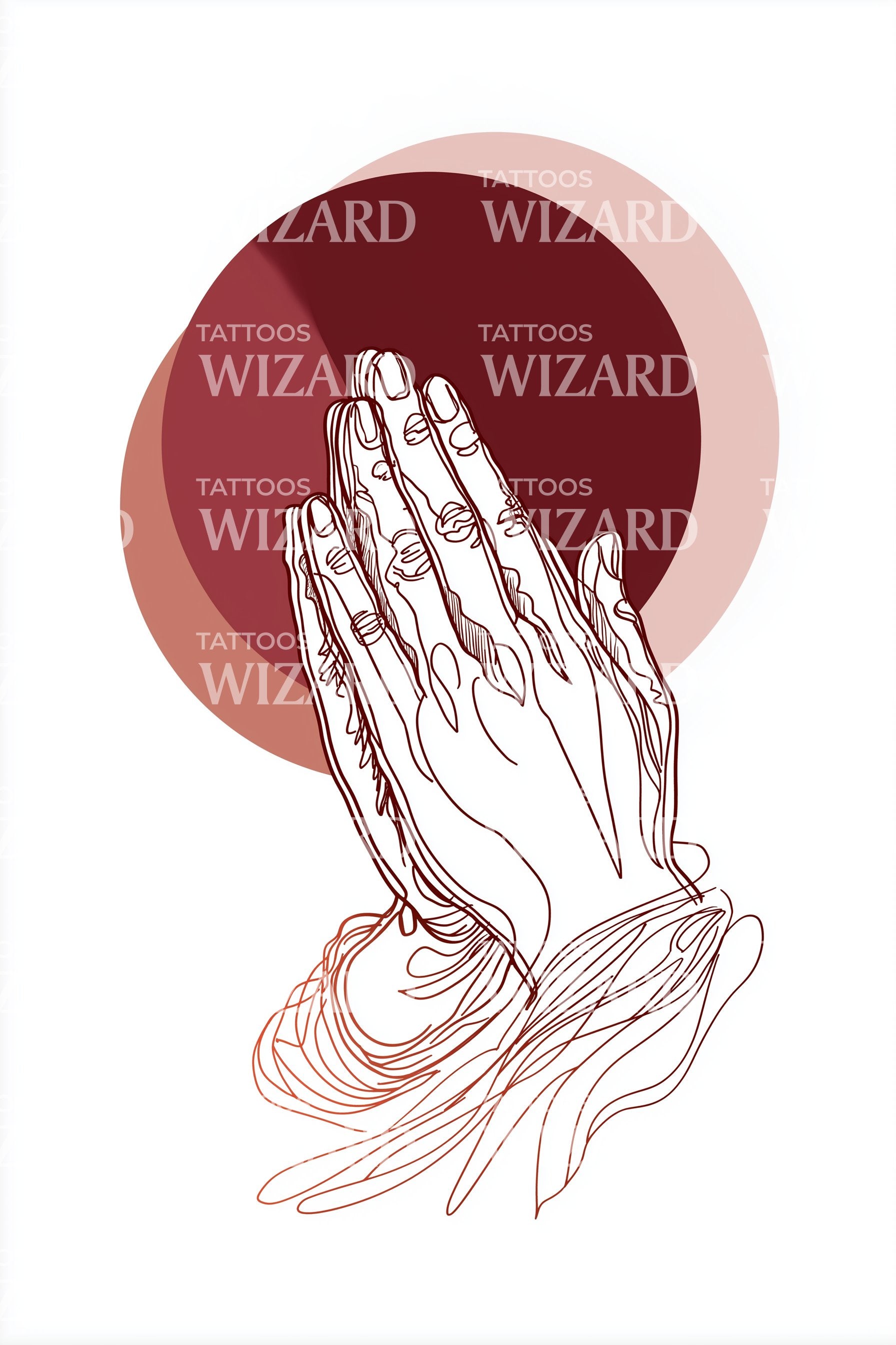 Watercolor minimalism frames finely lined praying hands beneath a layered sun disc, soft terracotta bleeding into rose. The radiant circle becomes an aura of faith, a daily altar on skin. Wearing it invites devotion, calm heat, and steady guidance, a quiet vow to rise with light each dawn.