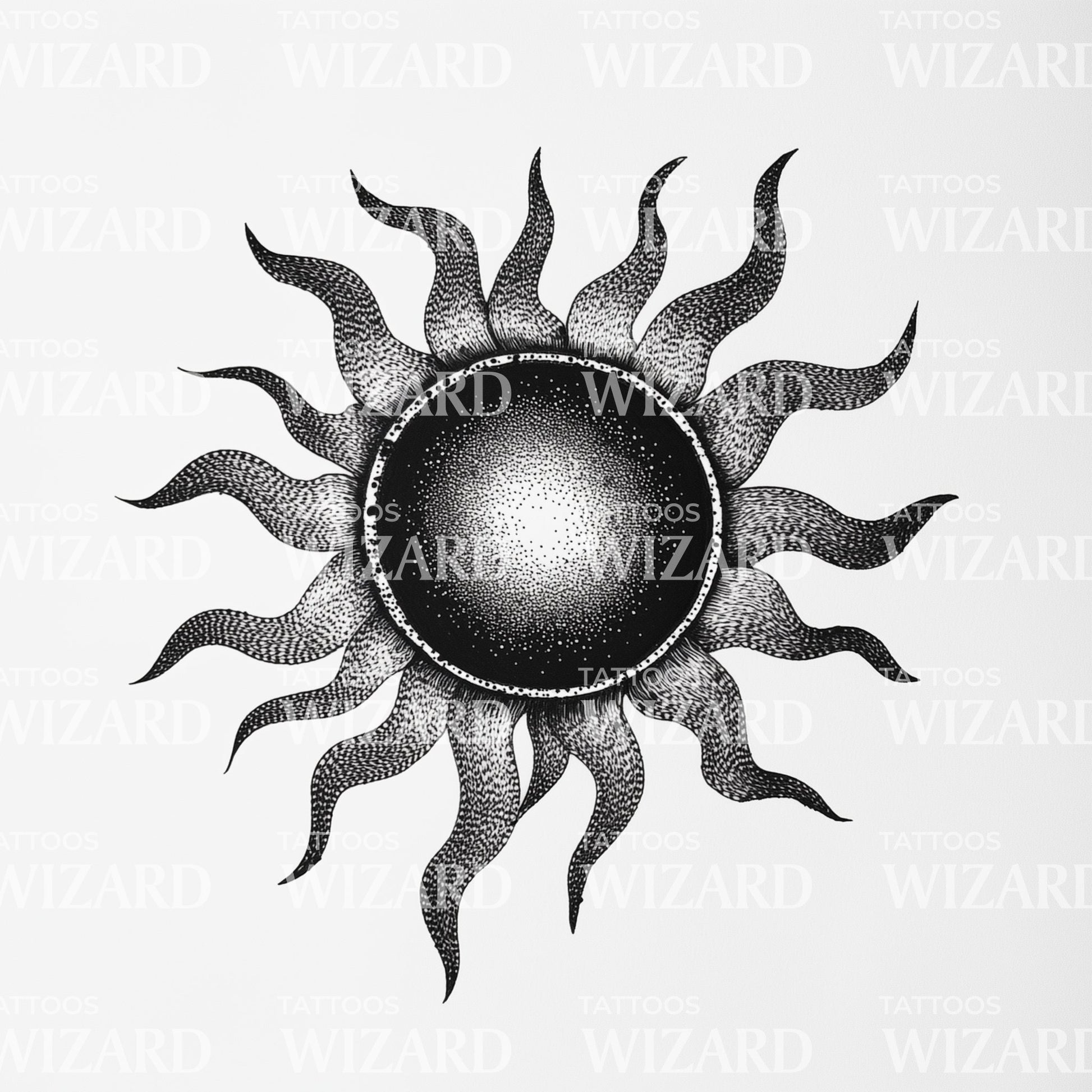 Ponořte se do zářivé přitažlivosti tohoto blackwork tetování. Ztělesňující abstraktní prvky, tento složitý obraz upravuje planoucí slunce, živé plameny a zářivé paprsky, kde se dramaticky prolínají paprsky světla. Odvážná volba pro ty, kteří se odváží odhalit svého ohnivého ducha.