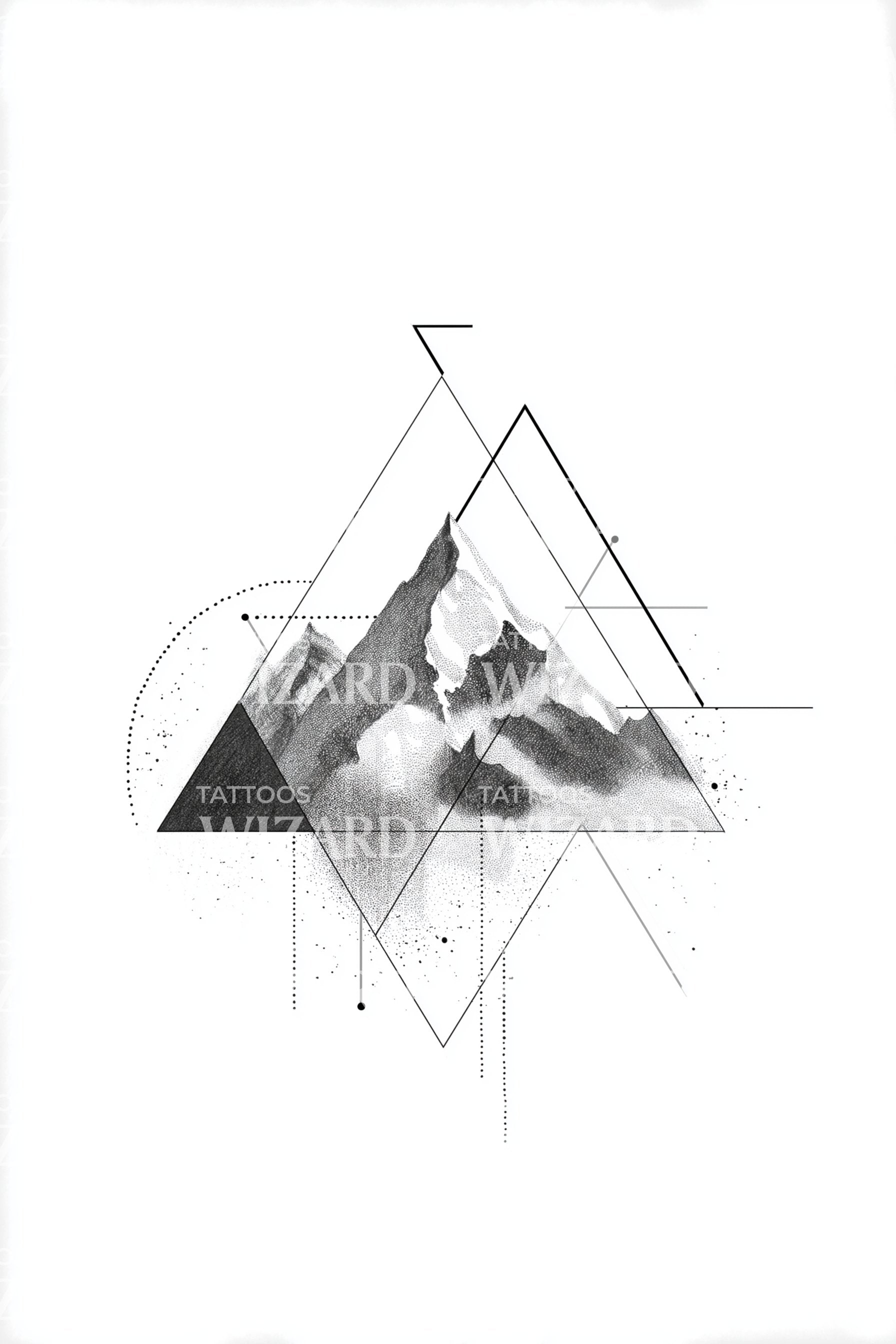 Sharp triangles frame a misty mountain rendered in dotwork, intersecting lines and subtle splatter creating a modern abstract collage of geometric shapes. The ascending peak within the triangle symbolizes clarity, balance, and steady progress. Wearing it feels like quiet momentum, a compass for focus, resilience, and grounded ambition.