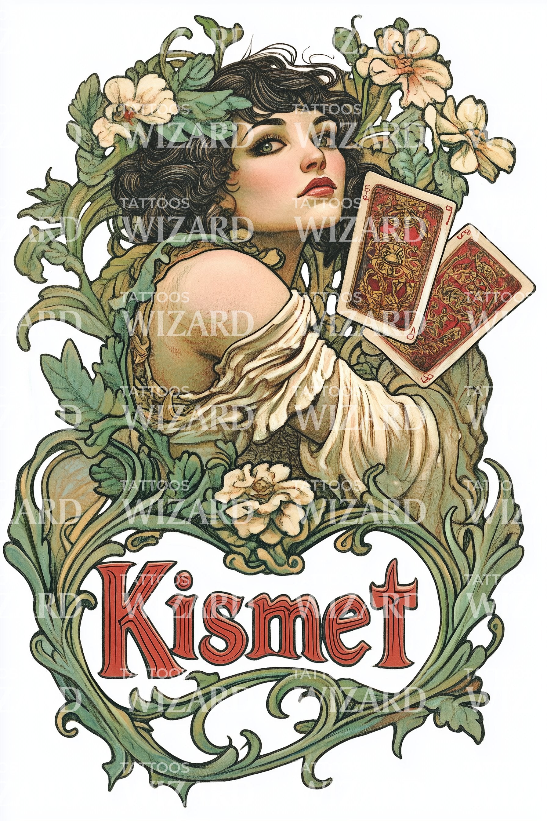 Opulent neotraditional portrait wreathed in florals and ornate scrollwork, with gilded tarot cards and Kismet glowing. Cards speak of fortune and choice; blooms promise renewal; gaze honors destiny met with courage. Wears like a prophecy. Ideal placements: upper arm, thigh, back, or calf suited to its curve-hugging flow.