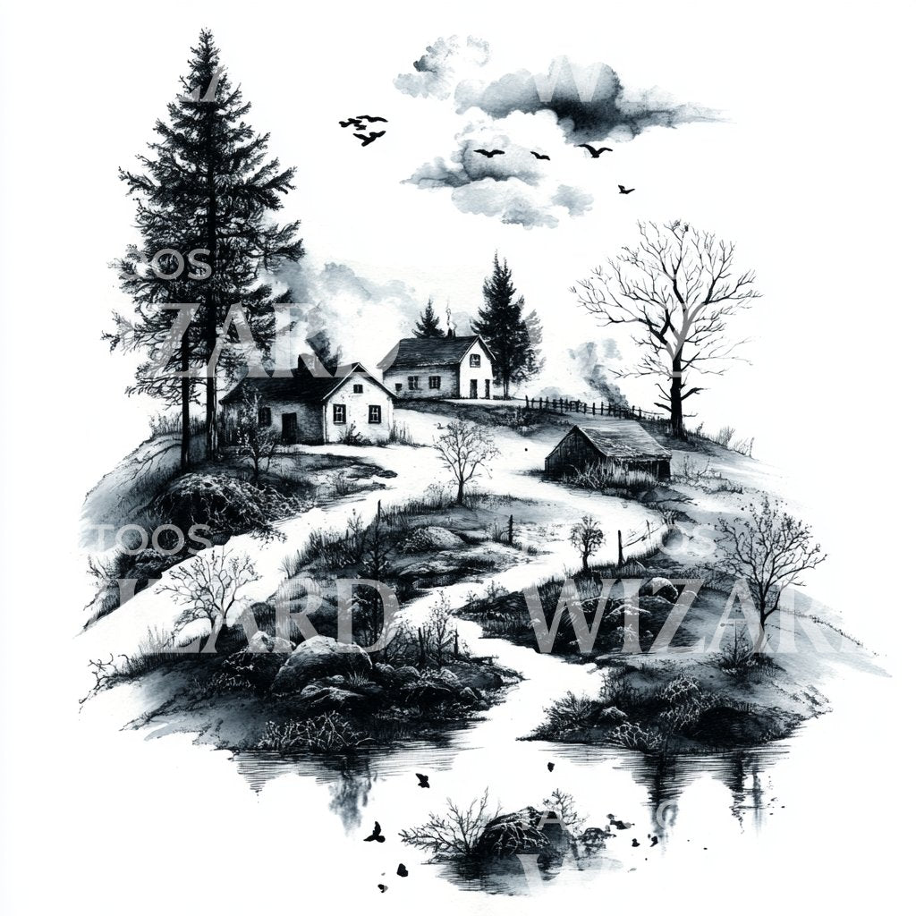 Ponořte se do klidu zimy s tímto černobílým tetovacím motivem, který zobrazuje okouzlující venkovskou krajinu. Vyjádřete svou lásku k poklidnému, zasněženému období detailním zobrazením útulné chalupy zasazené do klidného, sněhem pokrytého prostředí. Ideální pro milovníky přírody a zimní nadšence.