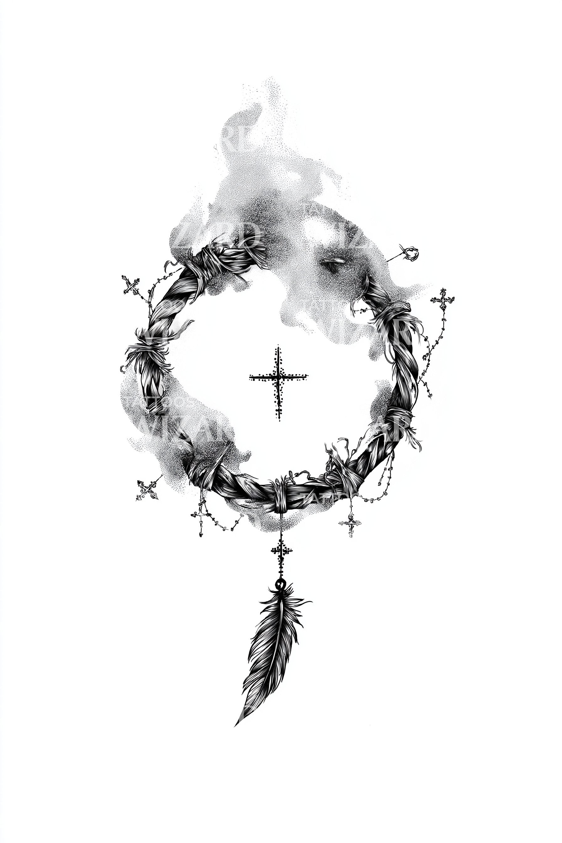 Smoke-laced watercolor forms a braided circle-wreath, dotted with delicate crosses and a single feather suspended below, a small star-cross shining inside. The ring speaks of cycles, guardianship, and spirit. Feather and smoke whisper guidance and release. Wearer feels watched over, calm, and courageously centered, grounded in quiet grace.
