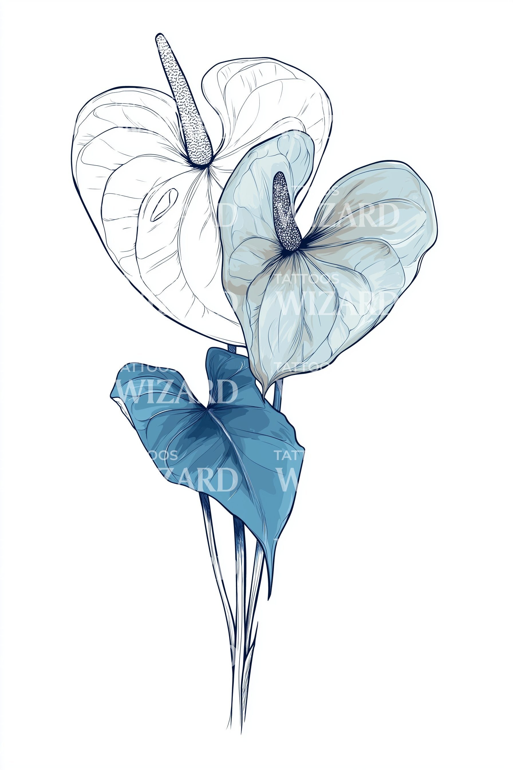 Curved anthurium flowers rise in delicate linework, softened by cool blue washes and a heart-shaped leaf. A botanical ode to hospitality, enduring love, and resilience, the spadix becomes a quiet compass. Minimal and graceful, this design brings calm confidence, inviting courage and tender self-love on the skin.