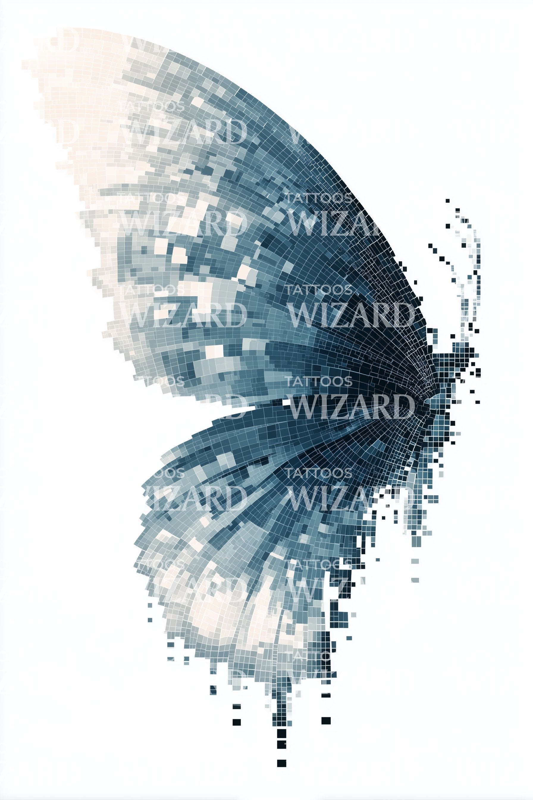 Fordyb dig i den unikke blanding af teknologi og natur med dette abstrakte pixel sommerfugletatoveringsdesign. Udstrålende en blid digital charme, konvergerer de blå geometriske former kunstfærdigt for at skabe en betagende sommerfugl. Dette indviklede design symboliserer transformation i den smukke sfære af en digital-abstrakt verden.