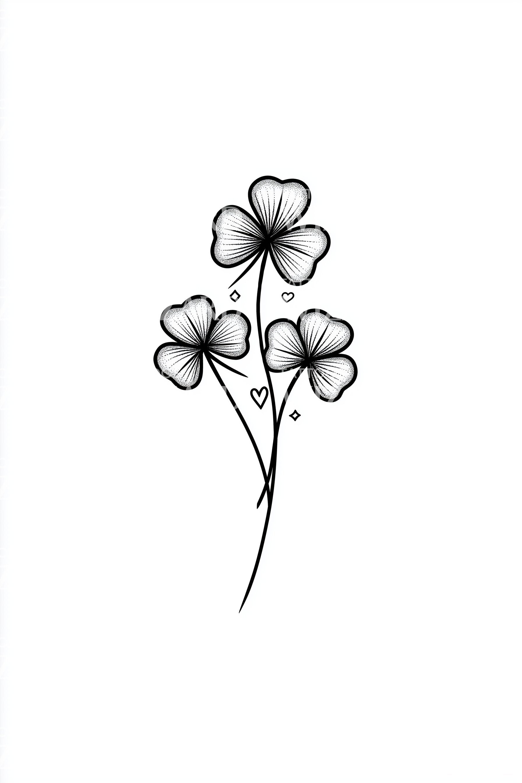 Fineline clover sprig rendered in whisper-light stipple, three heart-shaped leaves curling on slender stems with tiny hearts and diamonds. A minimal botanical honoring everyday luck, faith, and love, carried softly against the skin. Wears like a talisman: delicate, grounded, quietly hopeful, inviting serendipity wherever you wander each day.