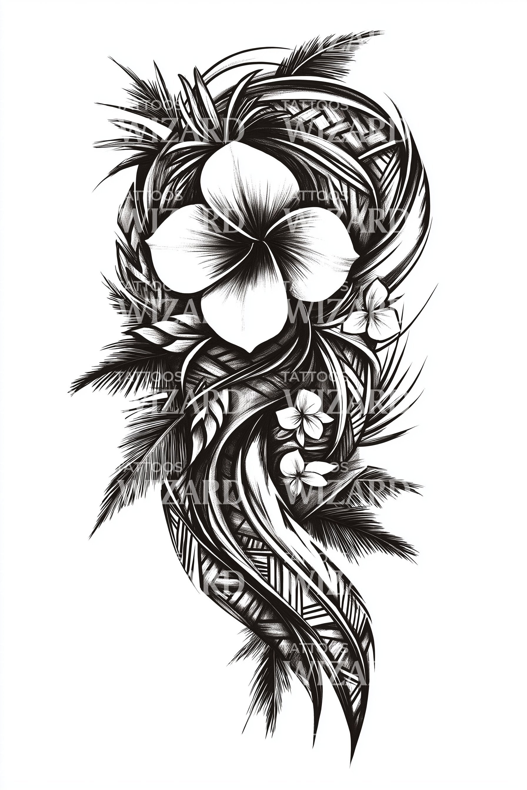 Fordyb dig i den stærke, men alligevel delikate skønhed i dette tribal-inspirerede tatoveringsdesign. Det indeholder den æteriske plumeria, præsenteret i karakteristiske buede linjer, der efterligner en flydende strøm. Tribal-mønstrenes flydende form fremhæver de blomsteragtige elementer og skaber en harmonisk forbindelse mellem styrke og ynde.