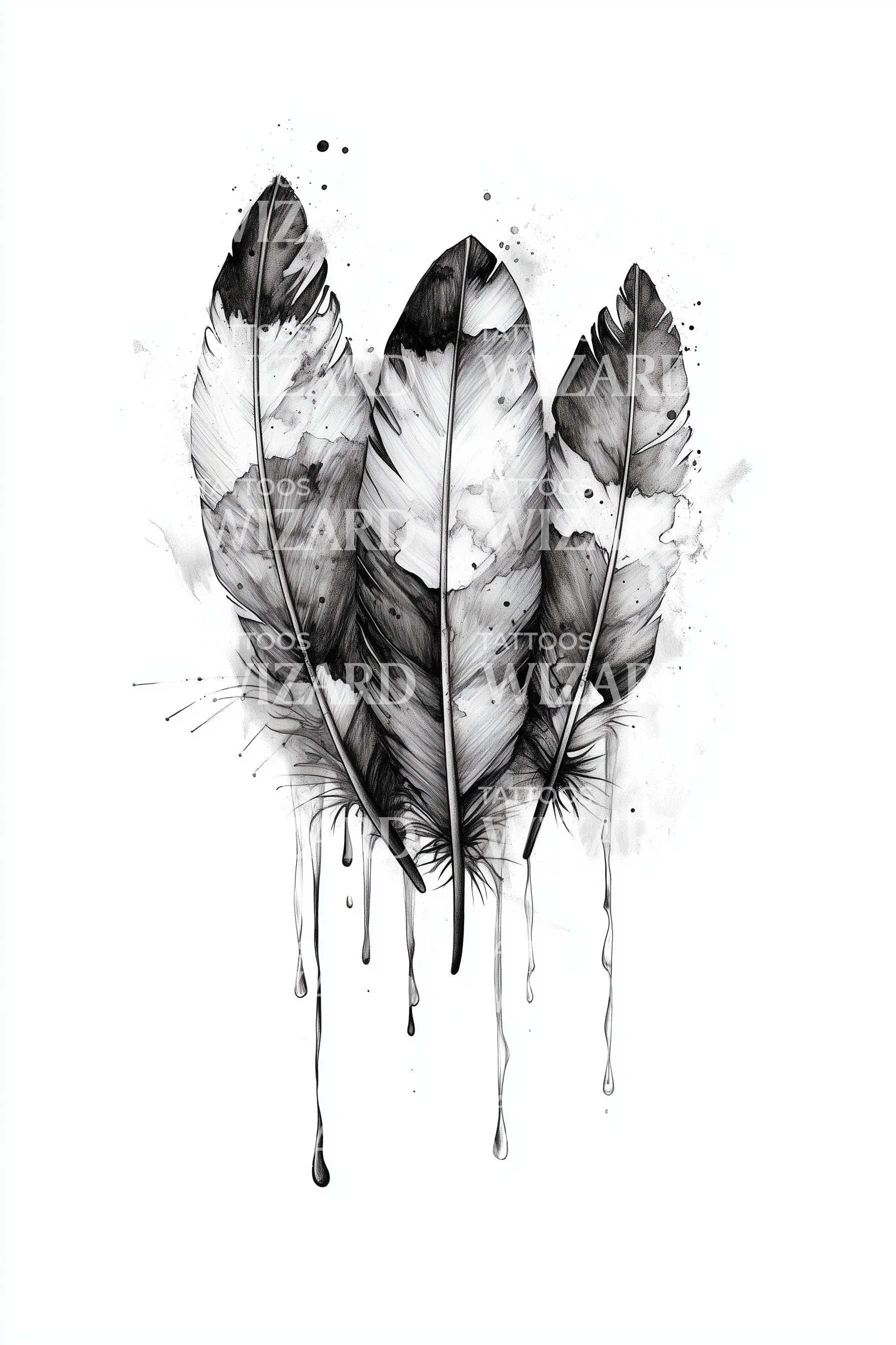 Ink-borne trio of blackwork feathers rises from watercolor haze, their tips melting into delicate drips and splatter. Tribal lines meet boho minimalism, honoring native wisdom, flight, and protection. Worn close, the piece whispers guidance and courage, gifting airy freedom with rooted calm for every new path.