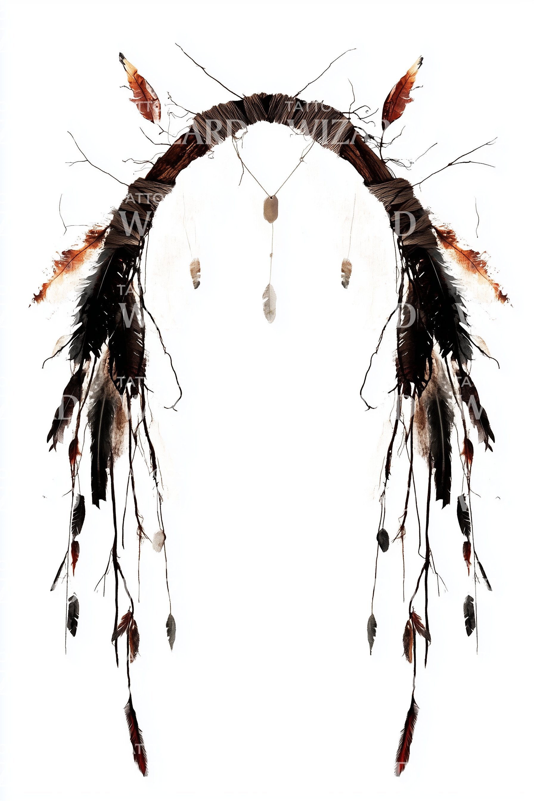 Ornamental arch of woven twine and dusk-black feathers, brushed with ember tones, frames delicate bead strings and stone talismans. Feathers speak of freedom and messages from spirit; the arch forms sanctuary, a threshold of protection. Worn as ink, it feels grounding, tribal, fierce, guiding journeys with ancestral blessing.