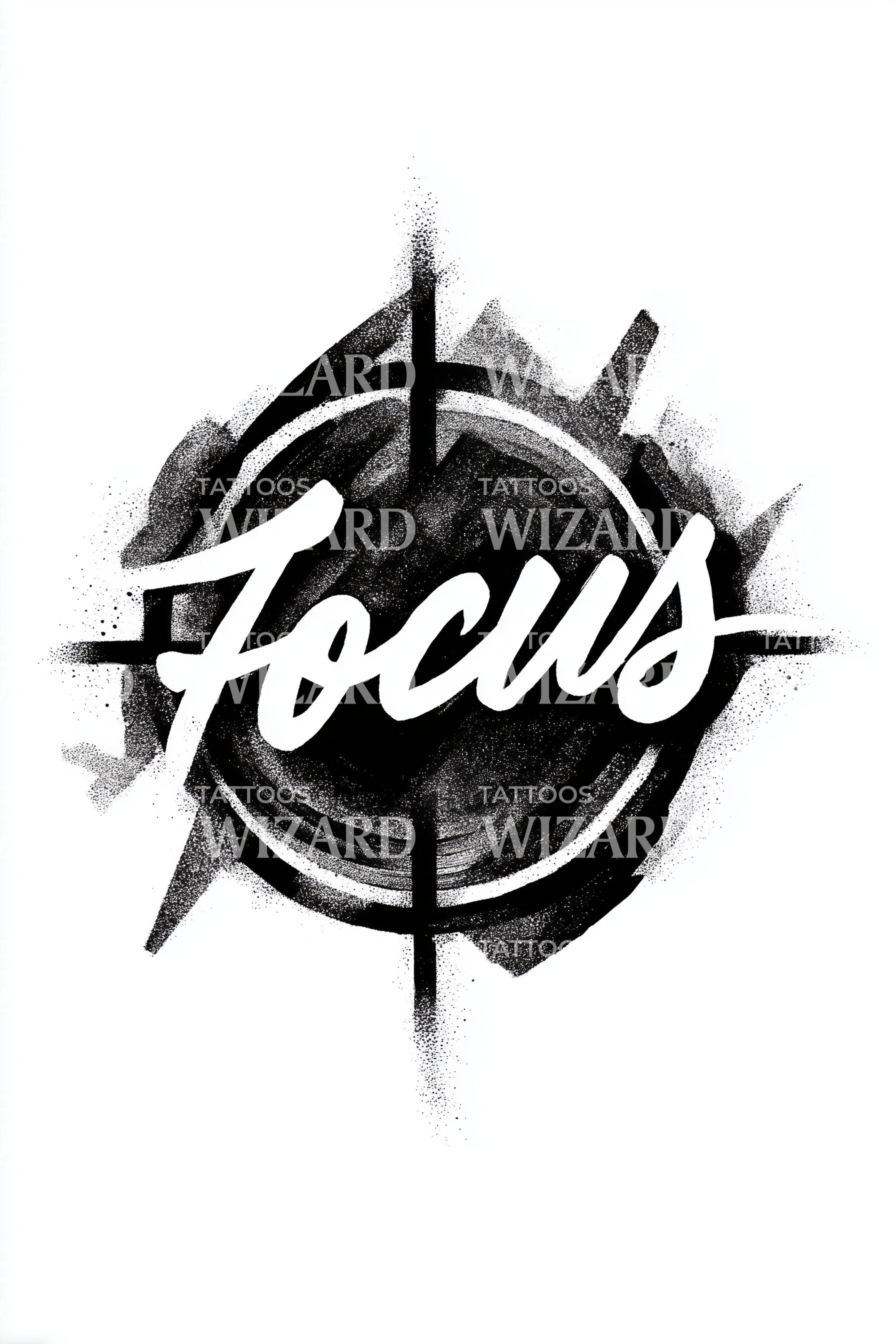 Blackwork crosshair rings and gritty spray textures frame bold script reading Focus. Target lines cut through smoky ink, creating a raw, urban halo. Symbolizing precision amidst chaos, this design locks onto intention, sharpening drive. Worn daily, it feels like a steady breath, centering goals and silencing noise.