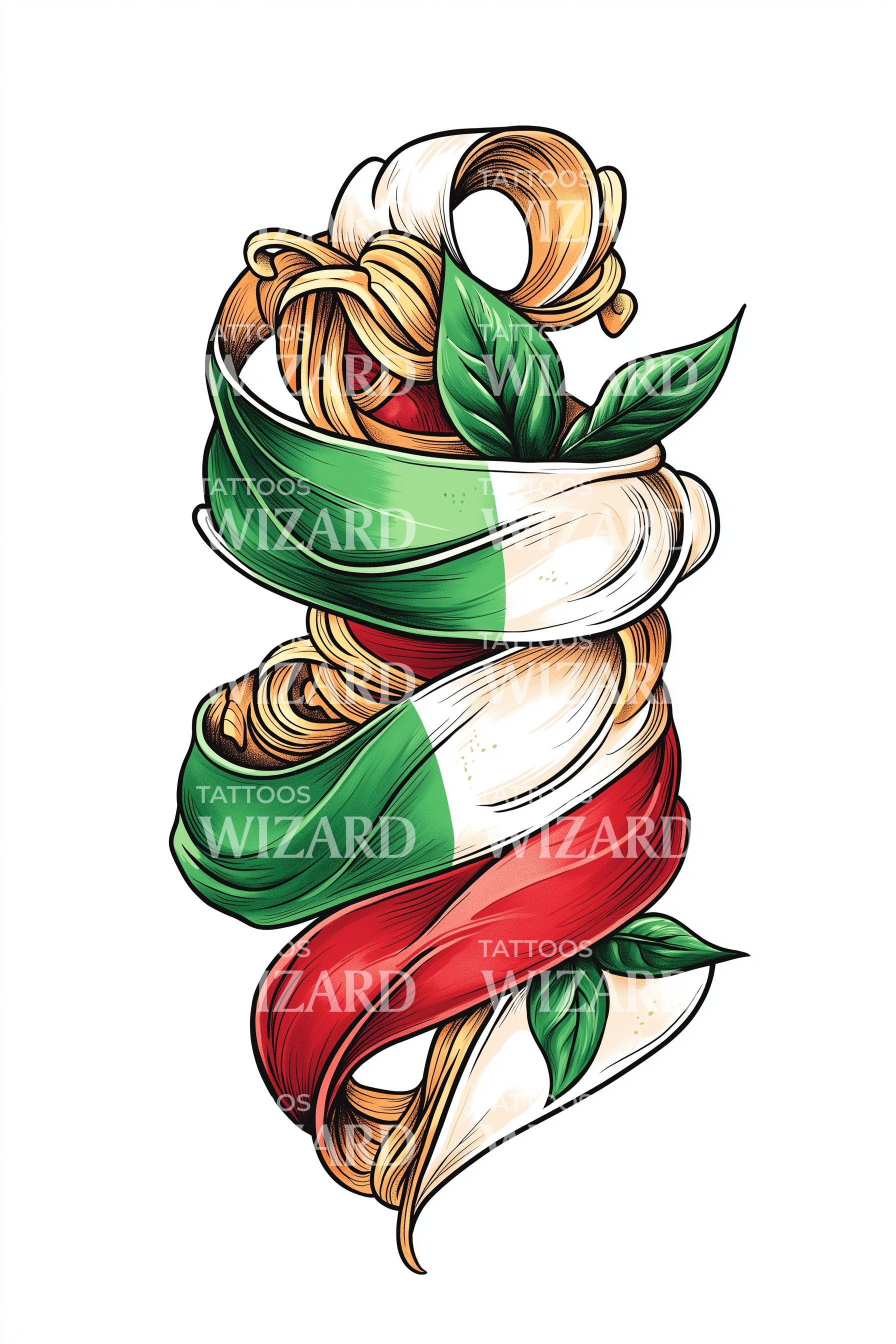 Udtryk dine italienske rødder og patriotisme med denne illustrativt designede tatovering. Livlige nuancer af Italiens flag snor sig elegant, sammenflettet i et båndmønster. Dette unikke, grønne og hvide tatoveringsdesign hylder Italien i en kunstnerisk og stilfuld stil, der gør et statement om kulturel stolthed og mode.