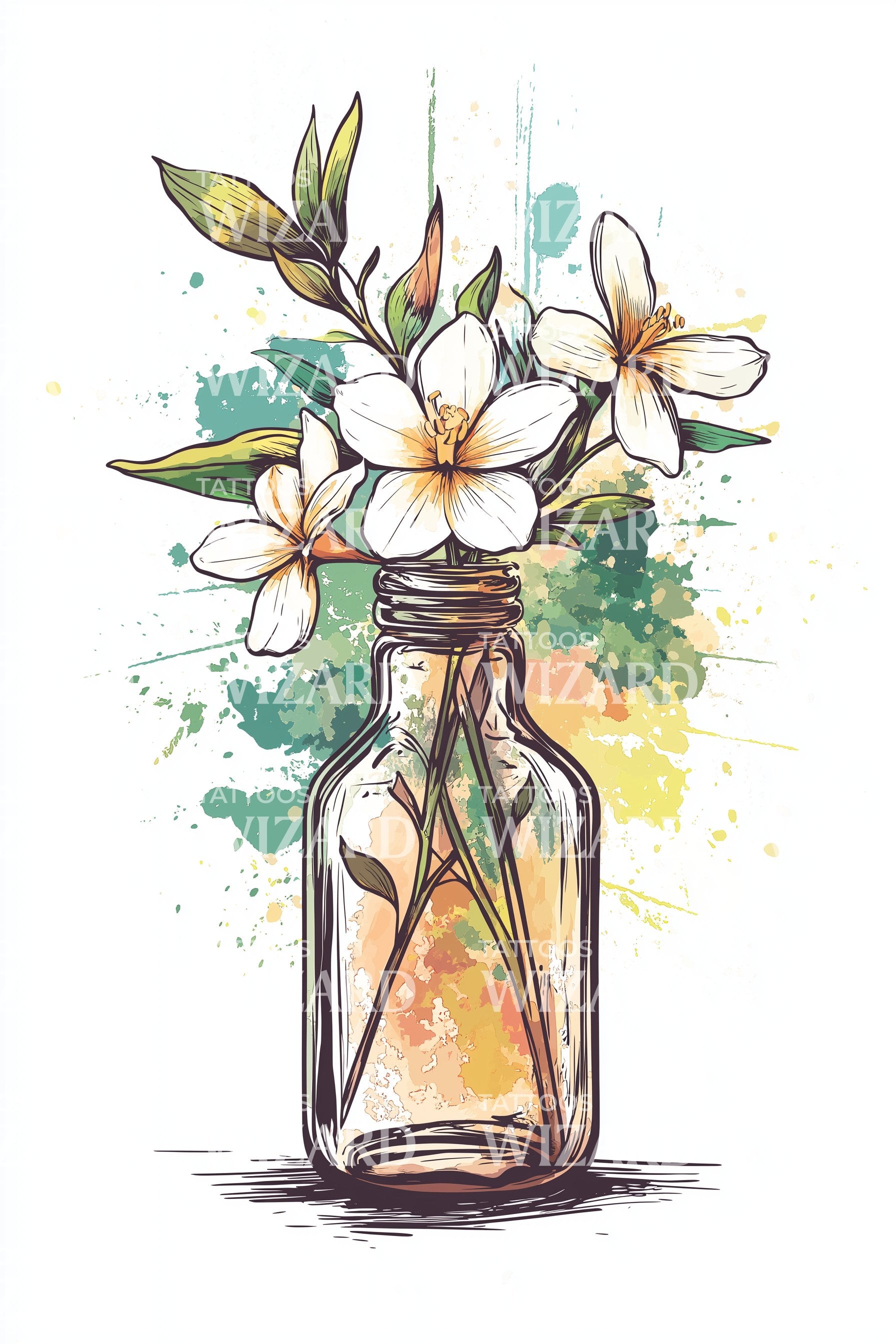 Fordyb dig i skønheden af dette akvarel-tatoveringsdesign. Det indfanger essensen af en sart jasminblomst indkapslet i en glasflaske, og dette værk kombinerer æterisk akvarelæstetik med indviklede detaljer. Et roligt og levende valg for dig, der søger et unikt udtryk for naturens kunstneriske skønhed.