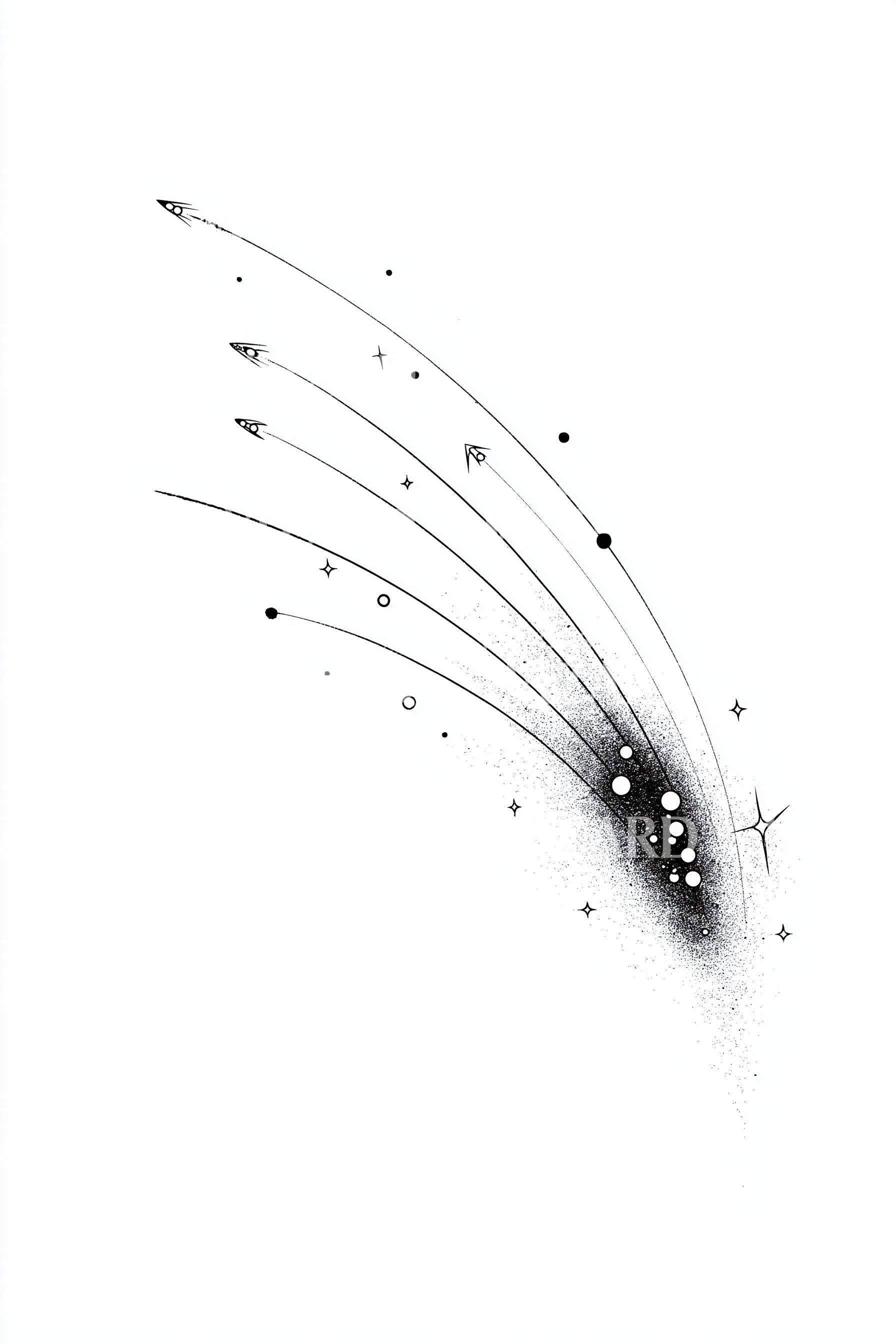 Oplev den kosmiske tiltrækning med dette Dotwork Meteor Shower Tattoo Design. Et visuelt fængslende indtryk af strejfende meteorer mod den betagende nattehimmel. Et fascinerende stykke, der indfanger rummets storhed, perfekt til dig, der er tiltrukket af himmelsk skønhed og kosmiske fænomener.