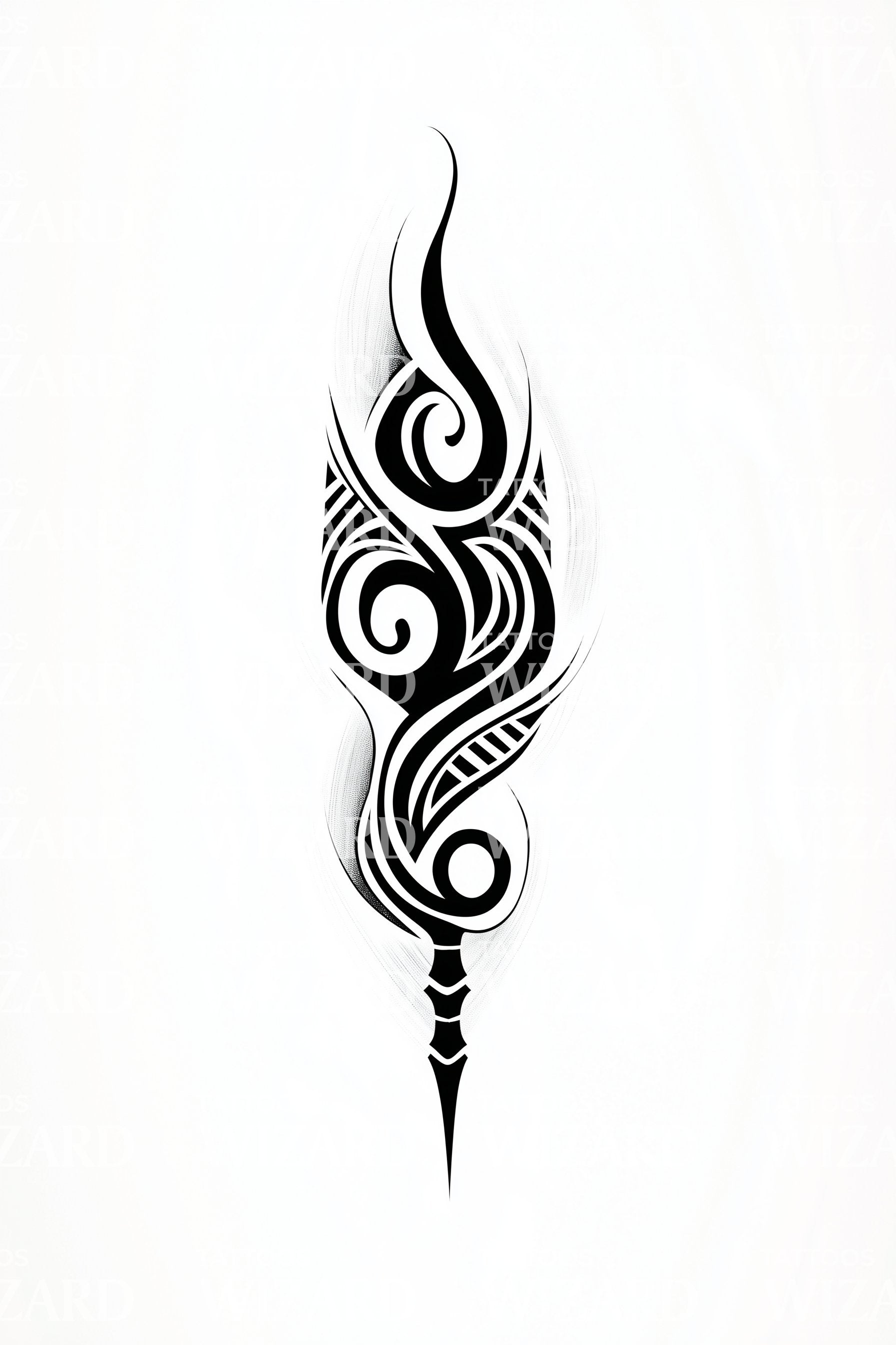Slip din mystiske energi løs med dette slanke, stammeinspirerede tatoveringsdesign. Tænd din finesse med dets karakteristiske flammeelementer. Hver kurve og linje væves indviklet sammen og indkapsler den rå, utrættelige natur i stammeæstetik. Denne tatovering er mere end et design, det er et vidnesbyrd om den frihedselskende kriger i dig.