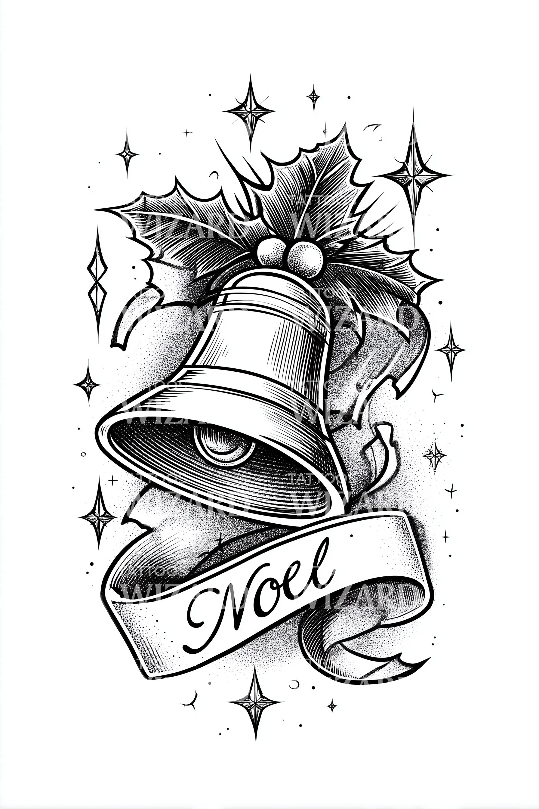 Crisp blackwork frames a gleaming bell crowned with holly, stippled shadows and starbursts floating around a Noel ribbon for Christmas. The bell calls joy and gathering; holly speaks of endurance through winter; Noel whispers renewal. Wearing it feels like candlelit carols, quiet snowfall, and festive warmth carried year-round inside.