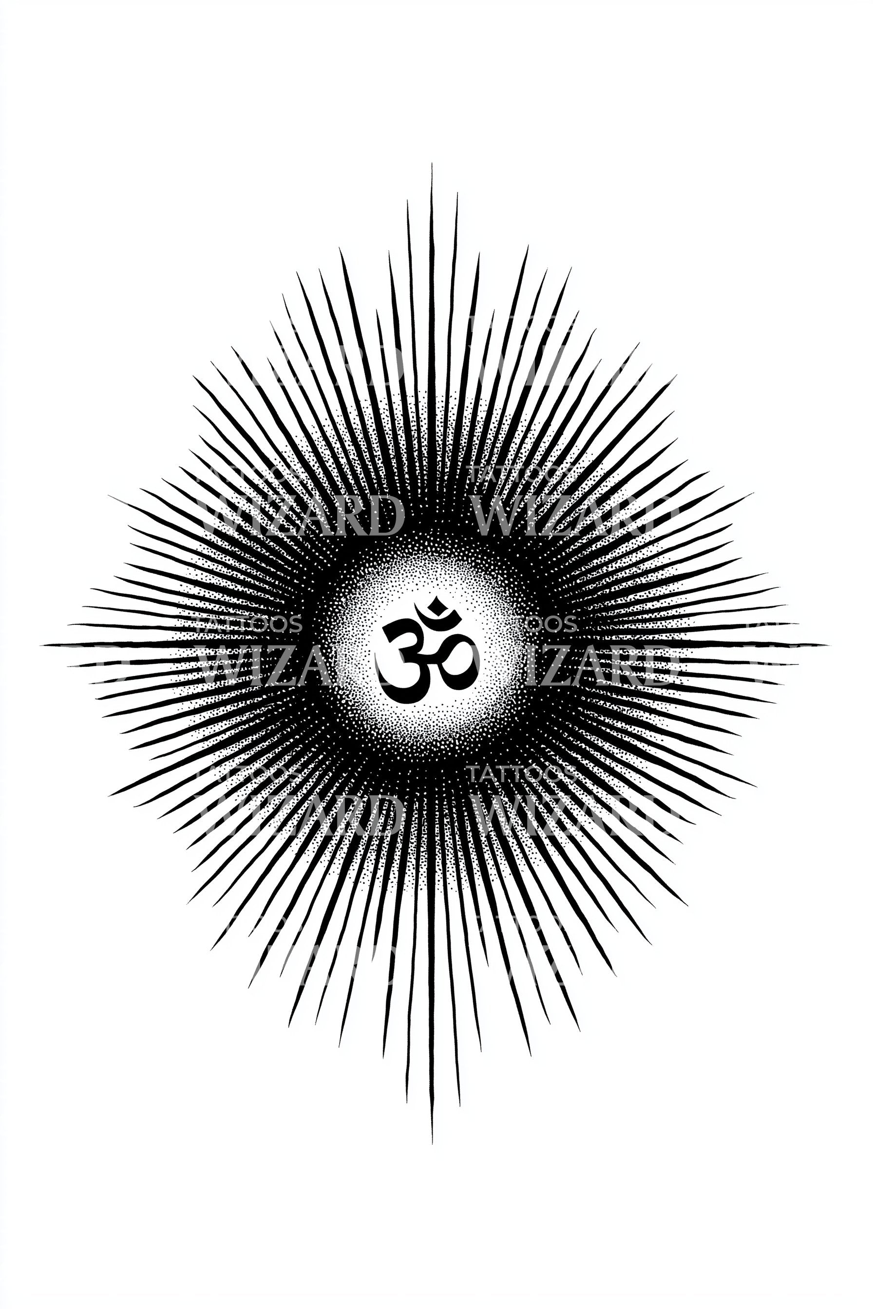 Fordyb dig i åndelig lykke med dette kosmiske Om-tatoveringsdesign. Indviklet dotwork skaber en betagende solstråle, der udsender æteriske energier. Den dybe sorte nuance forstærker dets himmelske dybde for en mere sand åndelig forbindelse. Omfavn stråleglansen fra dette fascinerende, kosmiske design og transcendér ind i guddommelig ro.