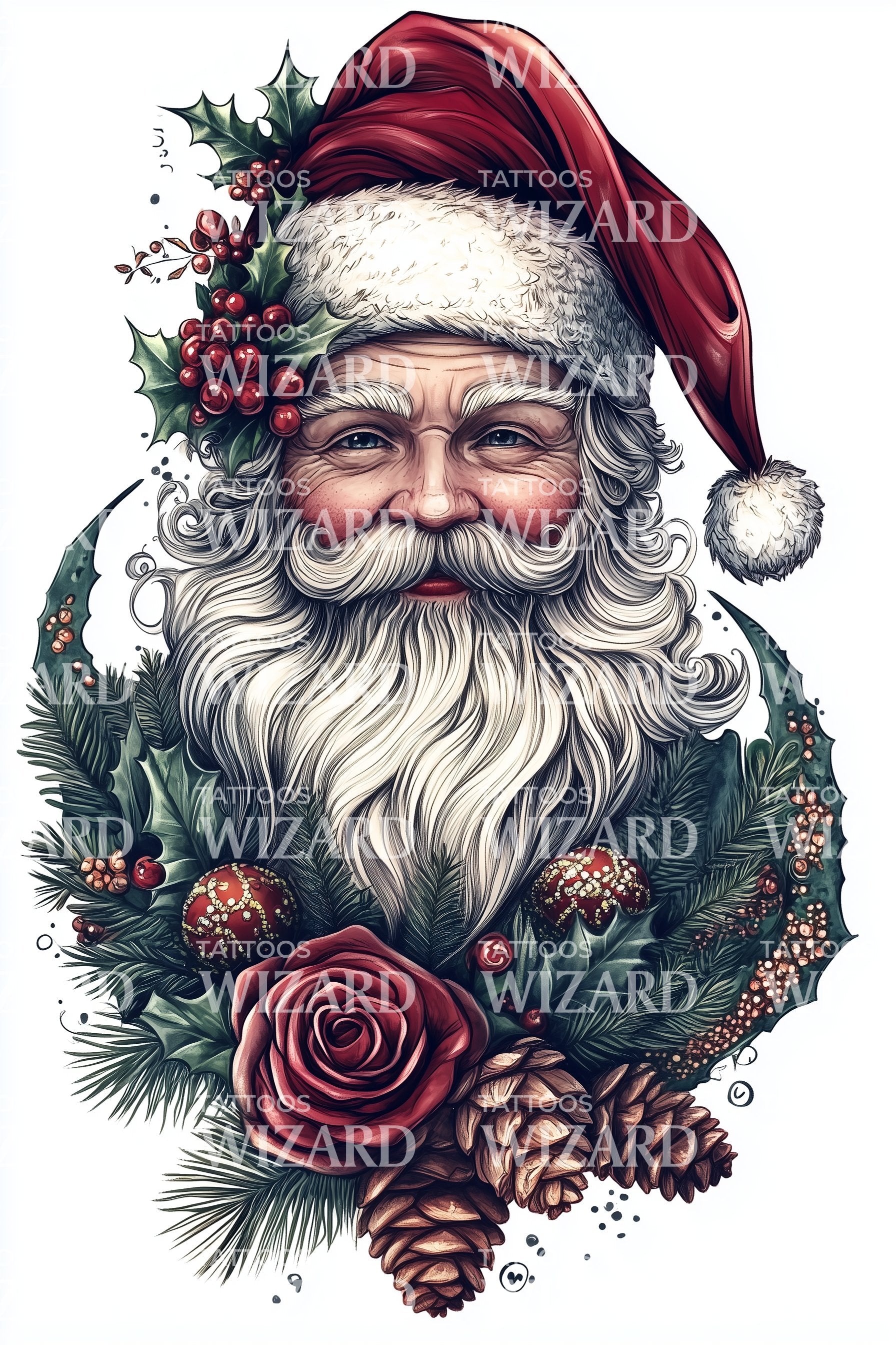 Neotraditional richness frames a classic Santa portrait, his flowing beard rendered in bold lines and creamy highlights. Holly, pine, cones, and a deep red rose encircle him, symbols of resilience, love, and enduring generosity. Wearing this brings holiday nostalgia, gentle courage, and warm, evergreen joy through every season.