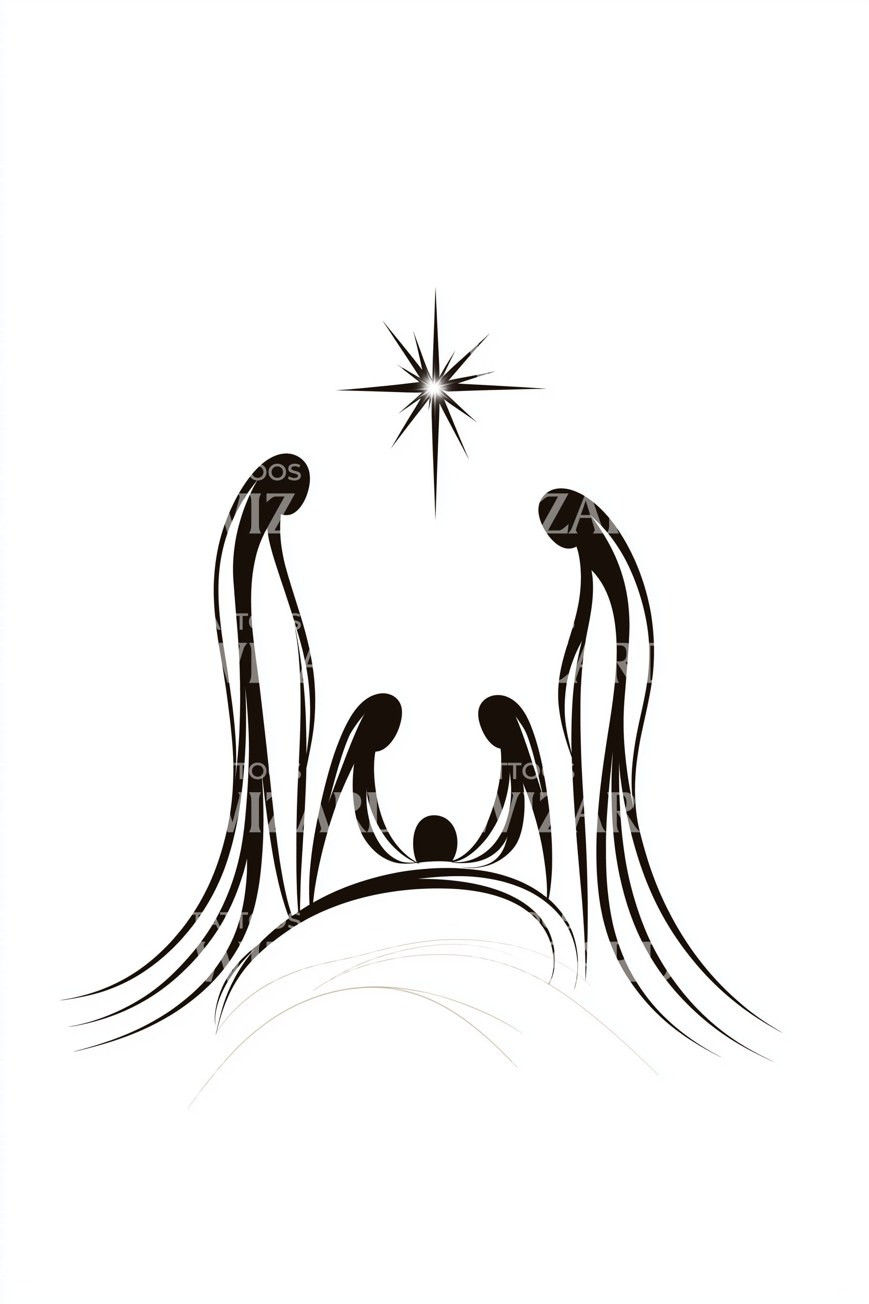 Blackwork silhouette nativity arcs in flowing lines, the holy family cradled beneath an eight-point star. Minimal strokes build a tender shelter, the stable suggested by curves. Symbol of faith, Christmas wonder, and sacred beginnings, this design carries quiet hope, guiding the wearer with serene, steadfast light and grace.