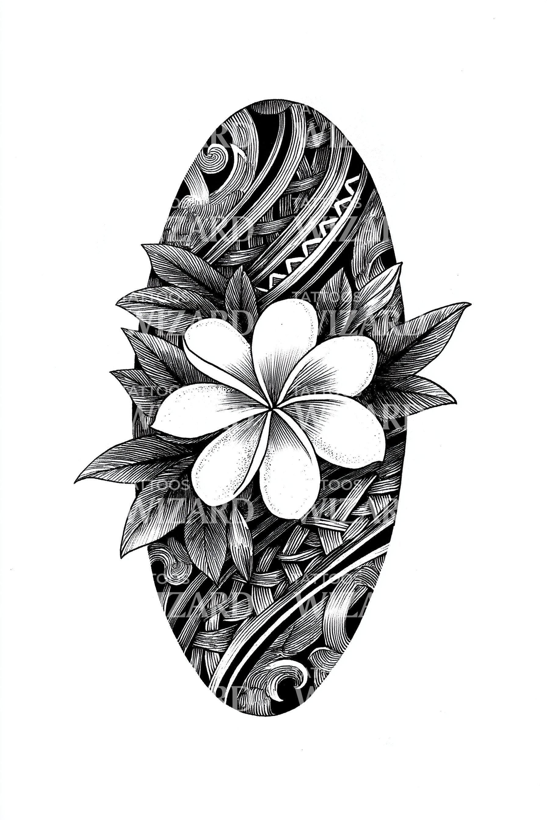 Omfavn din vilde side med dette stamme plumeria-tatoveringsdesign. Dets karakteristiske sort-grå skyggefangst fanger perfekt de svajende blad- og blomsterdetaljer og indkapsler essensen af stamme-kunst. Dette stykke repræsenterer ikke kun styrke, men også den delikate skønhed, der findes i naturen.