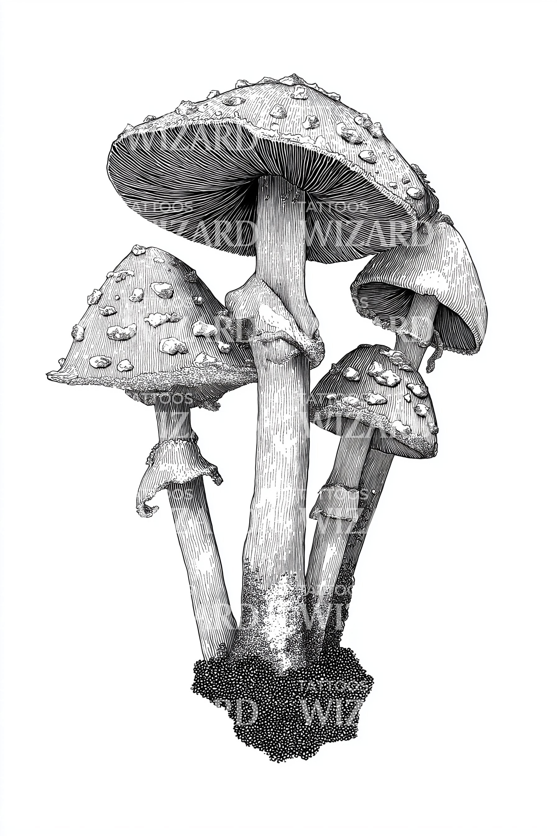 Tall mushrooms rising from woodland hush, a quiet cluster that honors the truths that grow in shadow. Drawn to the ones who rebuild after breaking, who trust the forest to teach patience. Black&grey shading becomes devotion. “Where the dark gathers, my light germinates.”