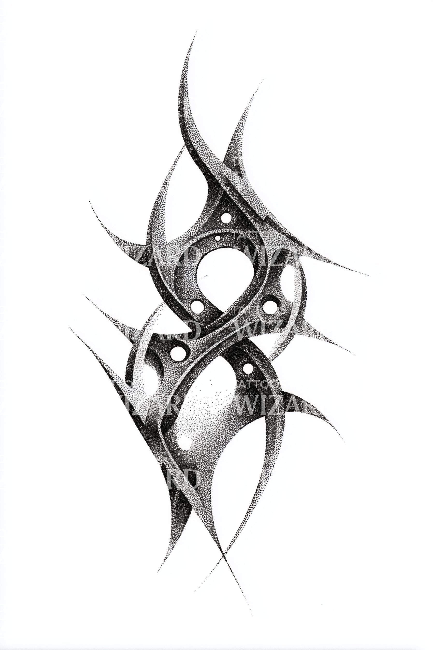 Slip din vilde kant løs med dette dynamiske stamme-tatoveringsdesign. Gennemsyret af abstrakte elementer, smelter dets sorte skår og pigge sømløst sammen og fremviser en kraftfuld stammeæstetik. Ideel til dig, der elsker dristige og markante tatoveringer, som tiltrækker opmærksomhed og udstråler personlig styrke.