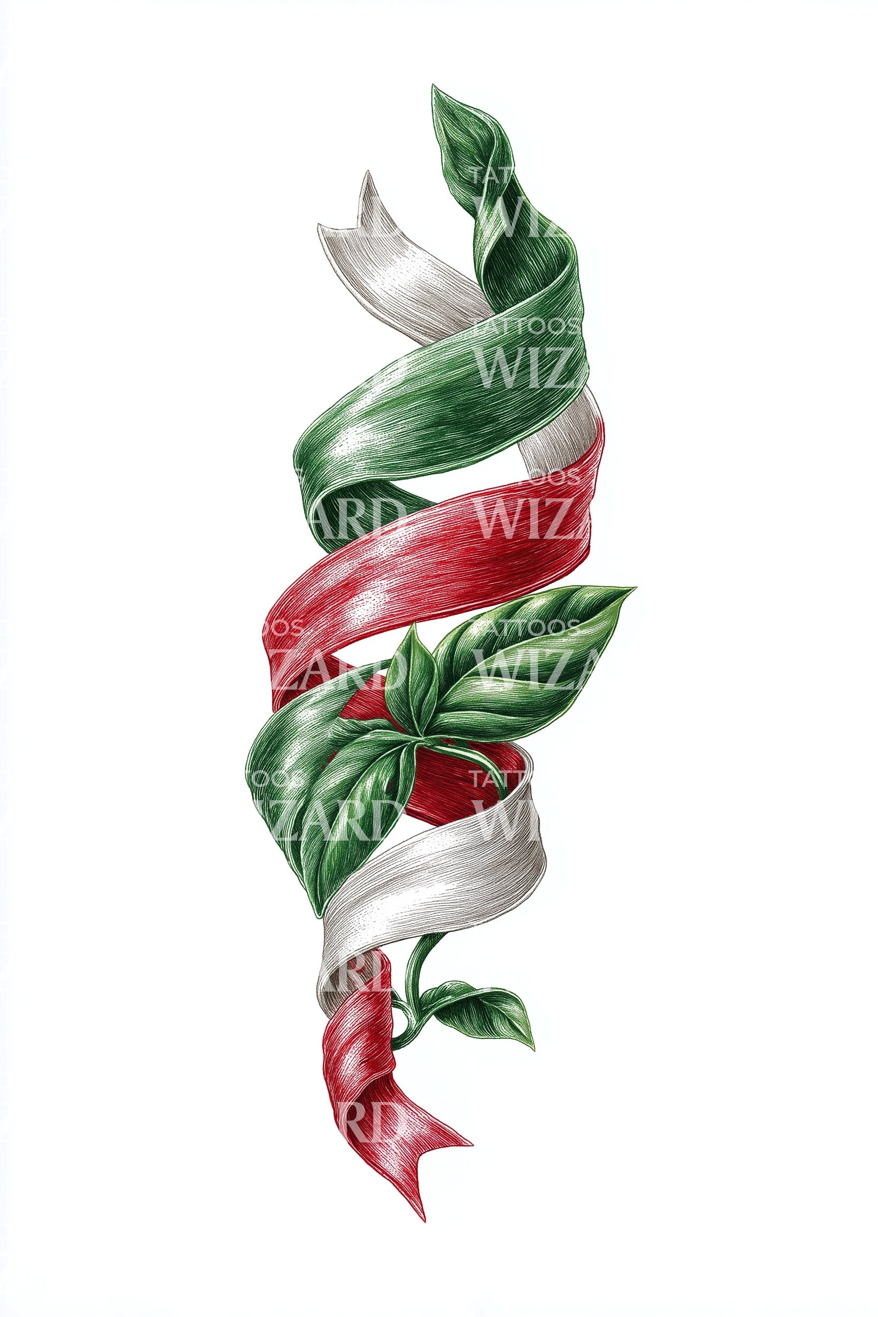 Vis din italienske stolthed med dette dynamiske illustrative tatoveringsdesign. De grønne og hvide nuancer fra det italienske flag snor sig elegant ind i en patriotisk fremvisning. Båndets finesse fremhæver din kærlighed til Italien på en unik, kunstnerisk måde. En smuk hyldest til ægte italienske patrioter!