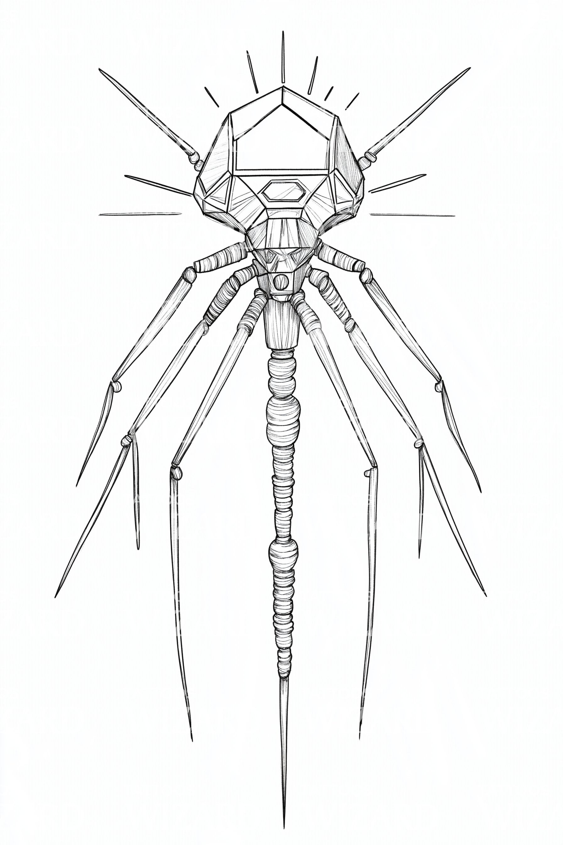 Bacteriophage logic rendered as devotion: a virus that does not destroy, it edits. Geometry and symmetry become a vow to meet chaos with linework, to turn fear into science. Drawn to the ones who heal by understanding. A calibrated prayer for microscopic thunder.