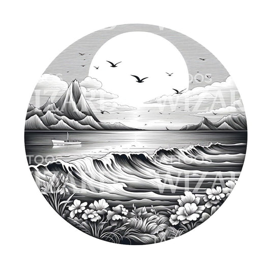 Urlaub Sonnenuntergang Insel Tattoo Design