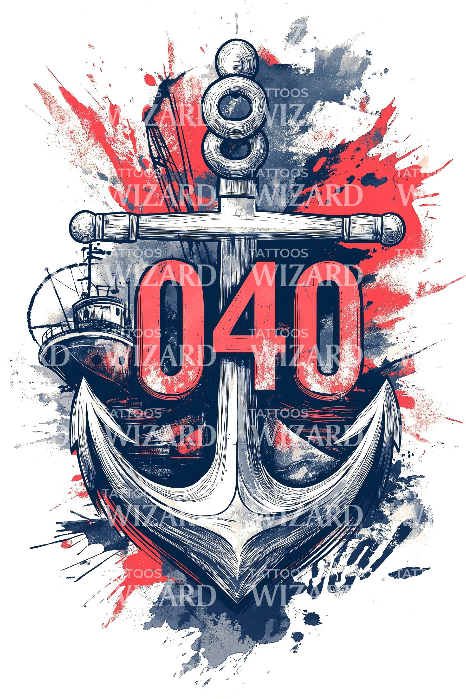 Wild watercolor splashes of harbor red and stormy indigo frame a steel anchor, cradling the proud 040. Dockside cranes and a working boat sketch nautical lines like memories. Symbol of Hamburg grit and steadfast love, this piece grounds wanderers, breathing salt air, courage, and homecoming into every heartbeat.