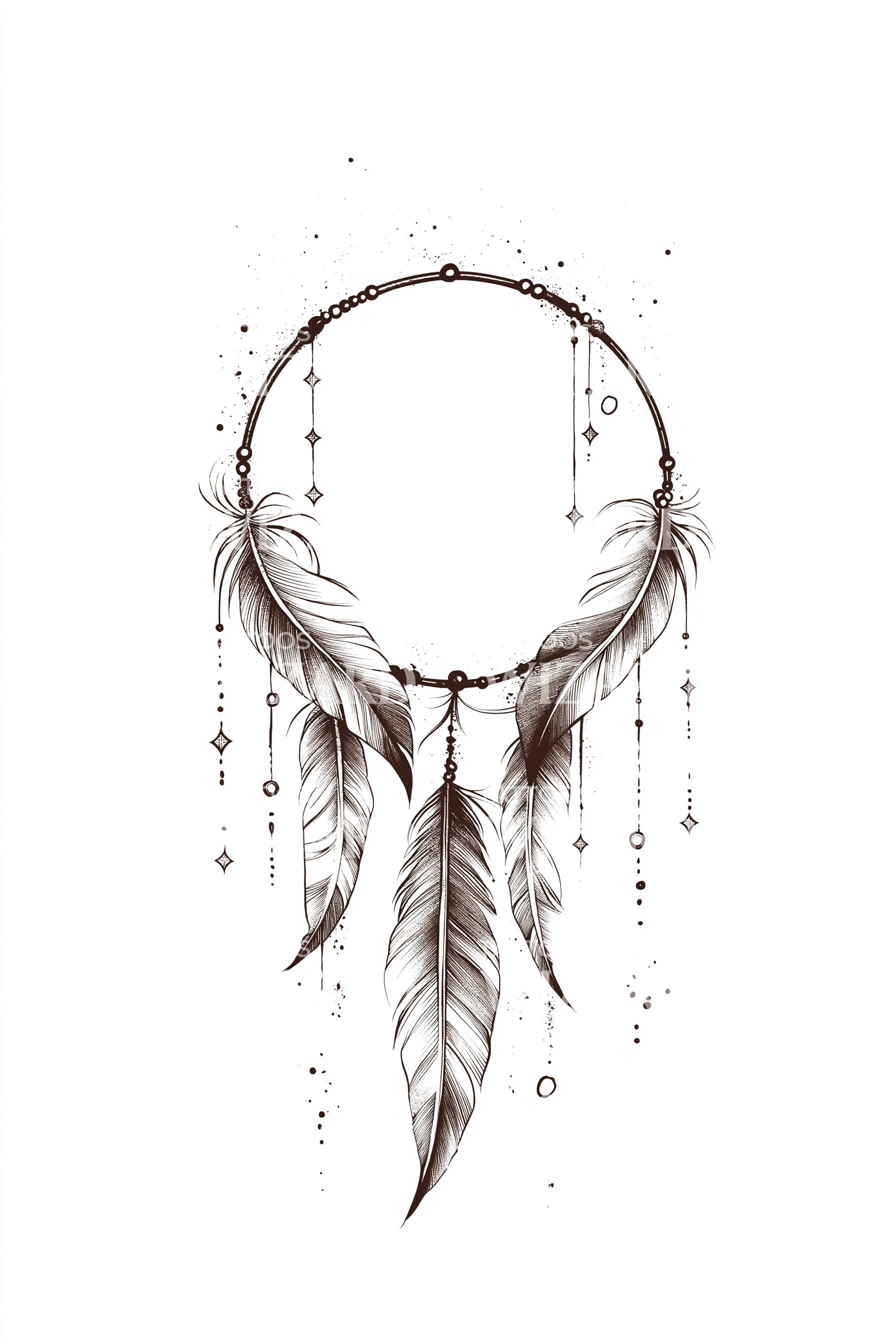 Delicate fineline dreamcatcher forms a beaded circle, sprinkled with cosmic dots and slender tribal charms. Three textured feathers drift softly, balanced by airy accents. Symbol of protection and purified dreams, the sacred hoop honors boho spirit and roots. Worn close, it feels calming, protective, and quietly fearless daily.